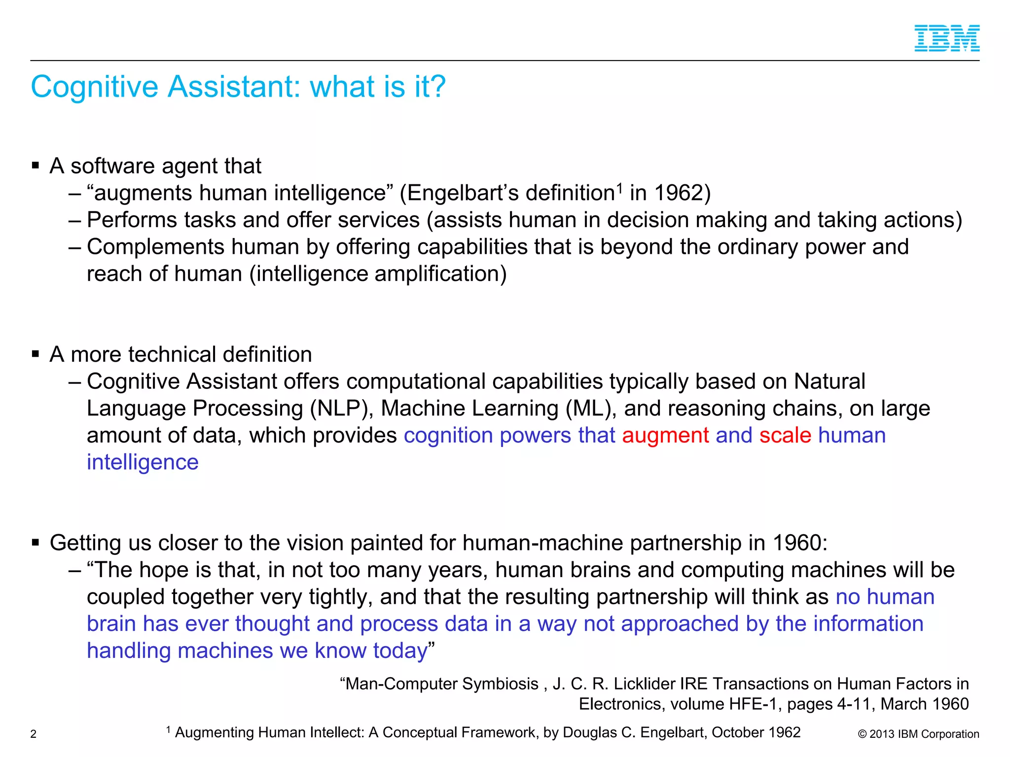 The document discusses cognitive assistants, which are software agents designed to enhance human intelligence through tasks and decision-making support using AI technologies like NLP and machine learning. It outlines historical developments, modern applications, and potential opportunities and challenges in creating these systems to assist knowledge workers. Key topics include the integration of cognitive systems in various sectors and the ongoing need for effective training, trust, and performance evaluation frameworks.