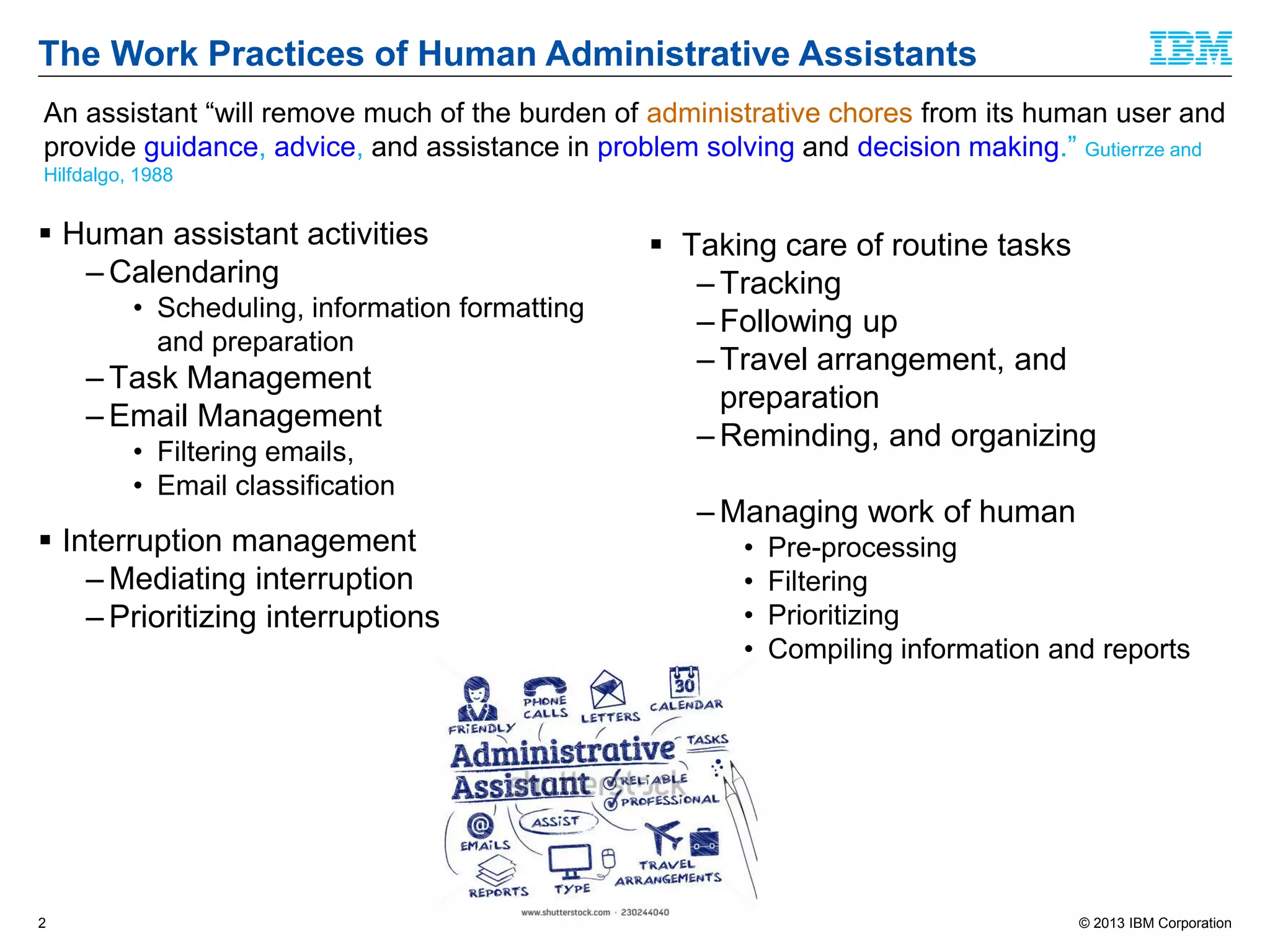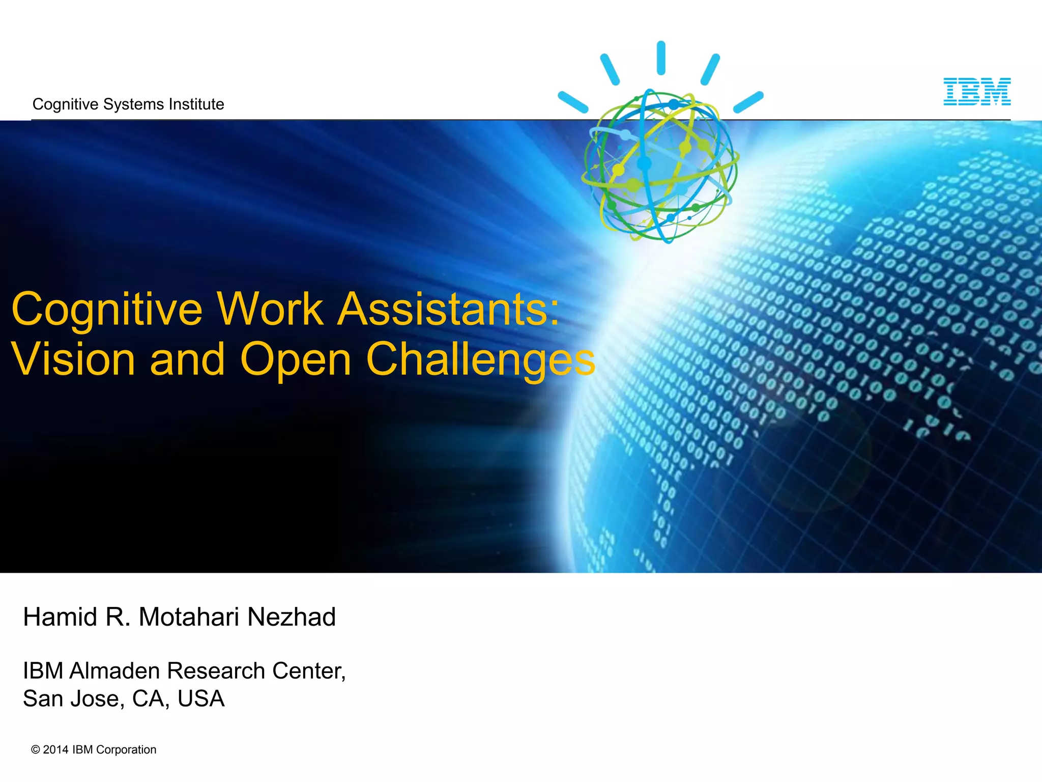 Cognitive assistants aim to augment human intelligence by performing administrative tasks and providing guidance, advice, and assistance to humans. Key challenges for cognitive assistants include building extensive domain knowledge, adapting to new domains, evaluating system performance, addressing user privacy and trust, and enabling natural language interaction. Developing cognitive assistants that can understand tasks, take proactive actions, and interact contextually remains an important area for future research.