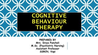 Cognitive behaviour therapy is a psychotherapeutic approach developed by Aaron Beck in 1963 based on the idea that behaviour is influenced by thinking. It focuses on identifying and changing faulty and dysfunctional thoughts, beliefs, and attitudes. The main techniques include thought stopping, counterbalancing intrusive cognitions, altering cognitions such as faulty inferences and overgeneralizations, and resolving problems directly. Cognitive therapy helps patients examine their beliefs, learn how beliefs influence feelings and behaviors, and alter dysfunctional beliefs that distort their experiences. The overall goal is to increase self-efficacy and control over life through a collaborative process between patient and therapist.