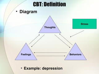 The document discusses cognitive behavioral therapy (CBT) for children and adolescents, detailing various cognitive and behavioral techniques used to address issues like OCD, PTSD, phobias, and more. It outlines commonly utilized materials, such as cognitive restructuring, relaxation training, and exposure exercises, to help modify maladaptive thoughts and behaviors. Dr. Priyanka Srivastava, a cognitive behavioral therapist in Noida, offers these services and consultations.