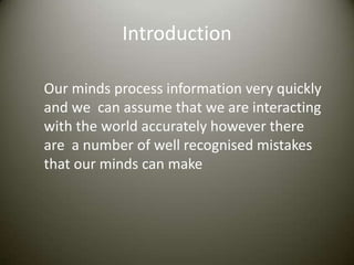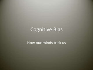 Our minds are subject to various cognitive biases that can lead to inaccurate assumptions. Some of the main biases discussed are confirmation bias, where we ignore opinions contradicting our views; in-group bias, where we favor our own groups; and gamblers fallacy, where we believe past events influence future probabilities. Other biases mentioned include post-purchase rationalization, neglecting probability, observational selection bias, status quo bias, negativity bias, bandwagon effect, projection bias, current moment bias, and anchoring effect. These unconscious biases can trick our minds and lead to faulty decisions.