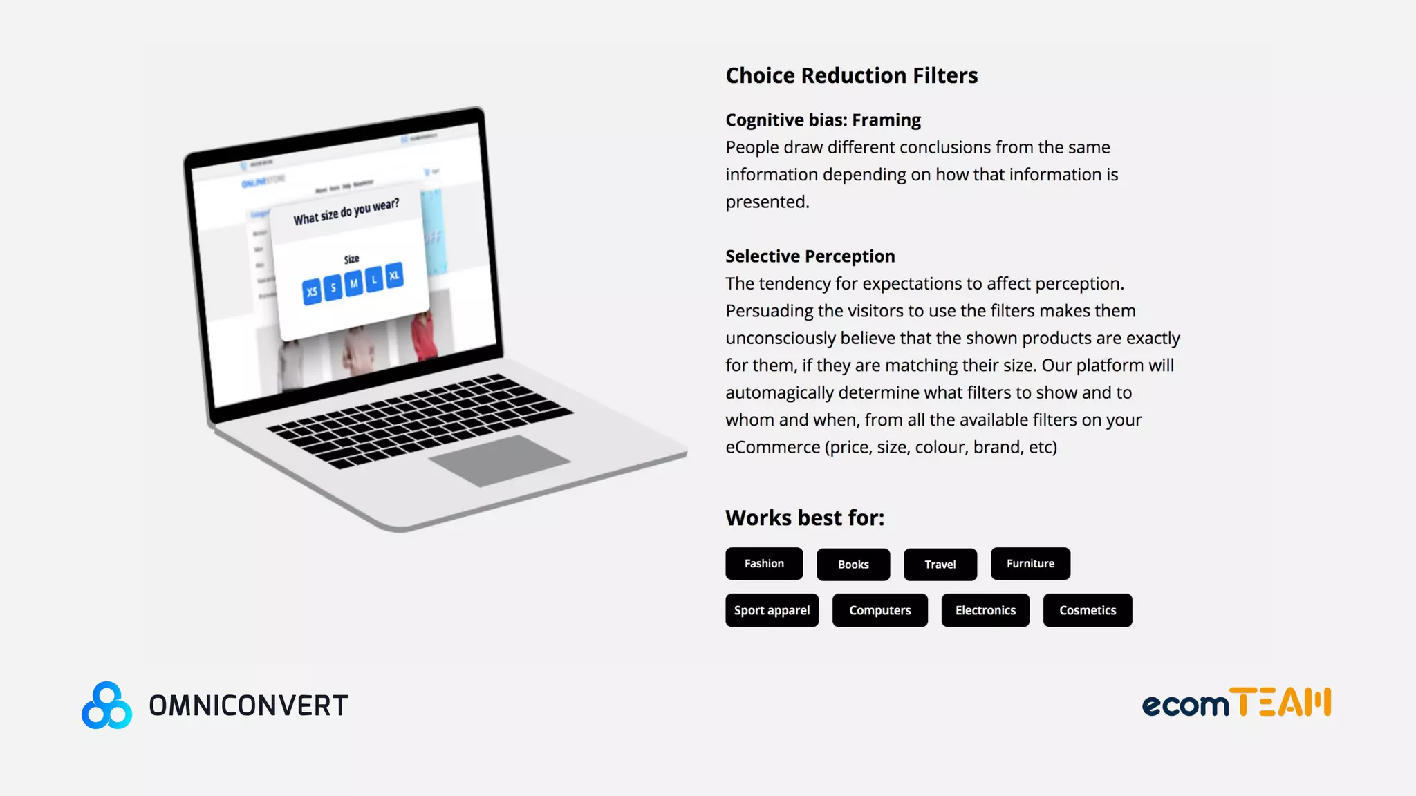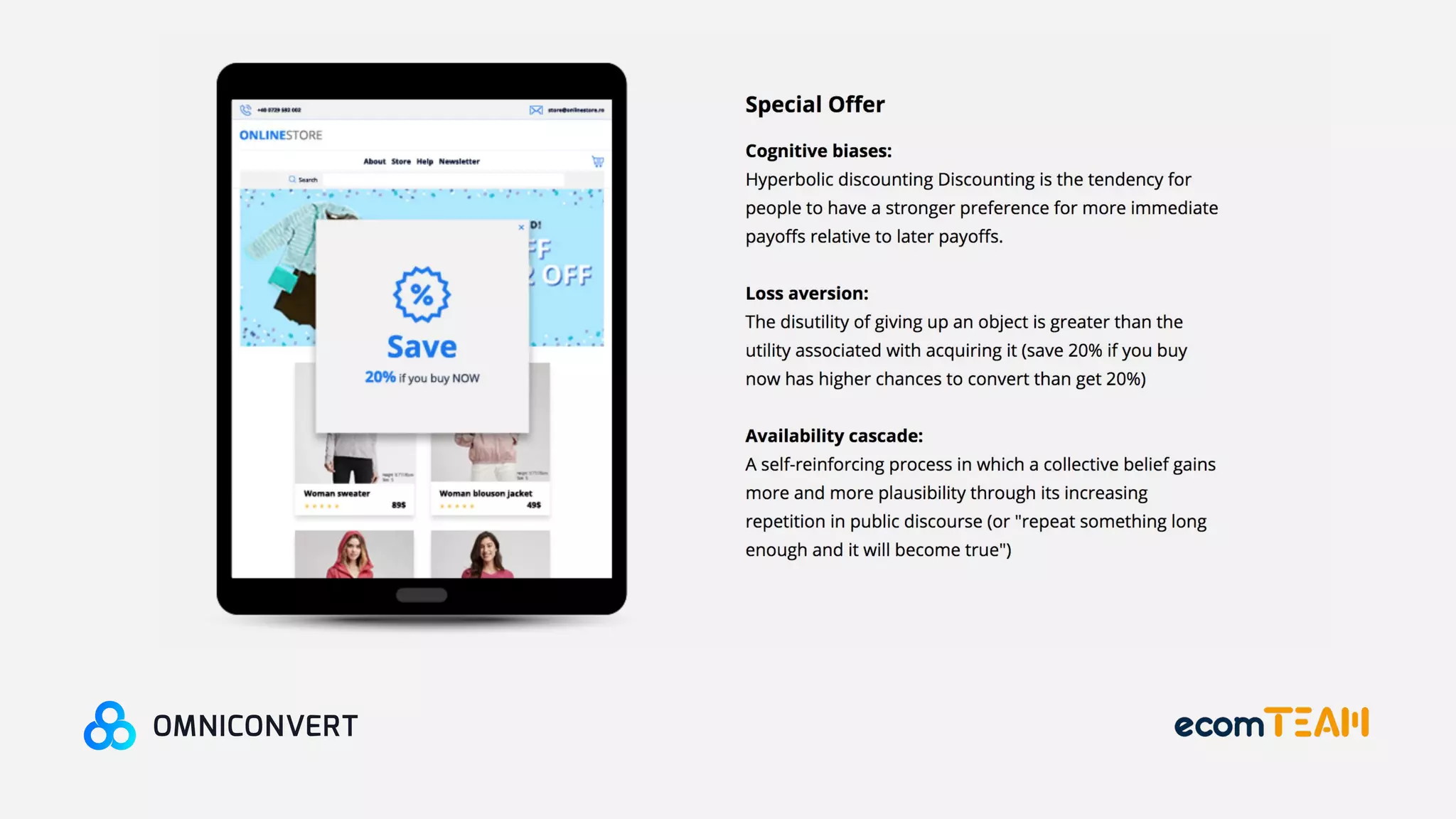 The document discusses the application of cognitive biases in e-commerce optimization, highlighting how certain biases can influence consumer behavior and decision-making. It identifies 12 impactful cognitive biases supported by analysis from over 41,000 A/B tests across e-commerce websites, including effects like framing, loss aversion, and reciprocity. The insights reveal the importance of psychological factors in shaping sales strategies and enhancing conversion rates.