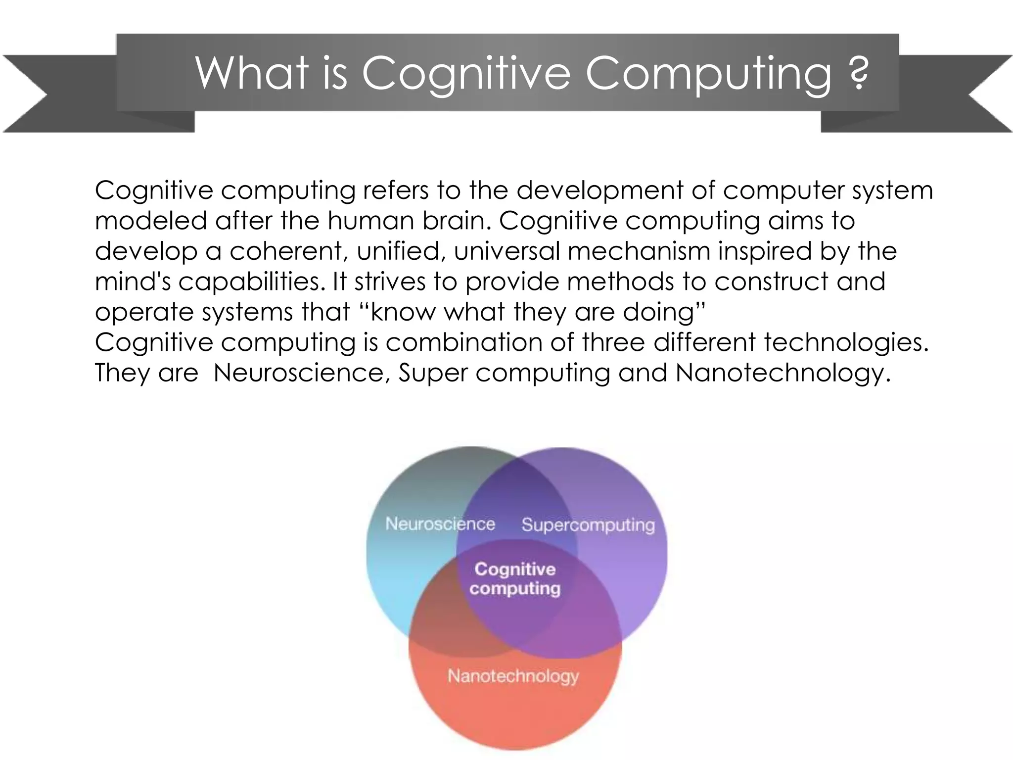 Cognitive computing involves developing computer systems inspired by the human brain's capabilities, combining neuroscience, supercomputing, and nanotechnology. Key advancements include IBM's Watson, an AI that processes natural language, and innovations enabling machines to mimic human senses. The future of cognitive computing holds potential for applications in various fields, enhancing decision-making and creating new industries.