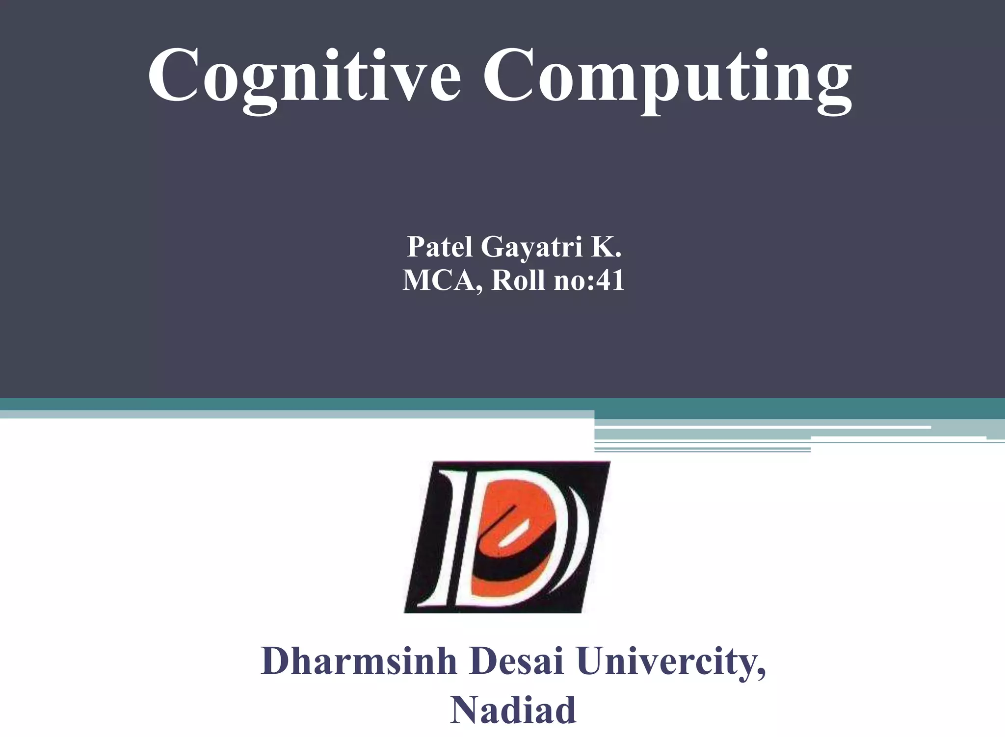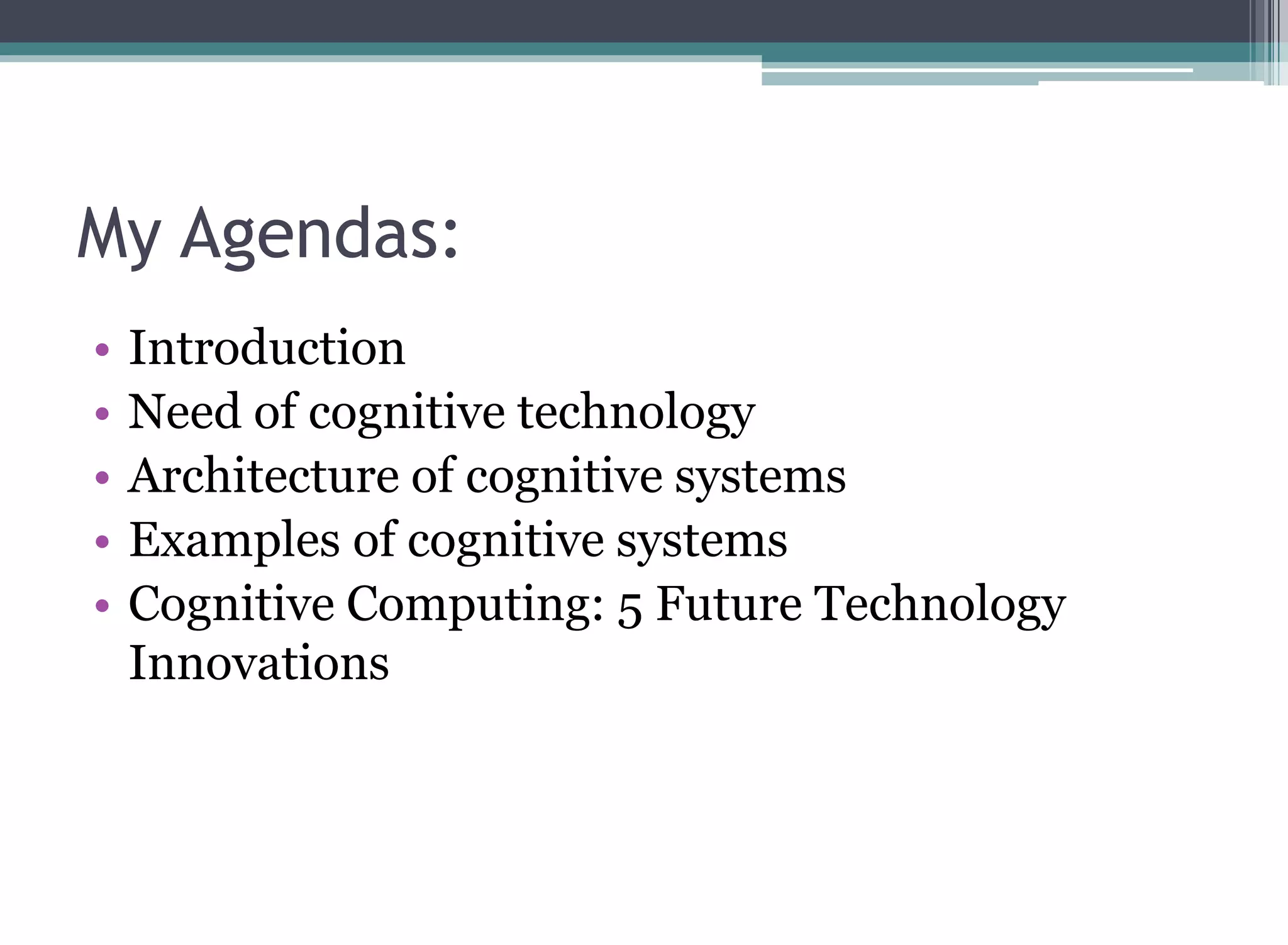 This document discusses cognitive computing. It begins with an introduction that defines cognition and cognitive computing. Cognitive computing aims to develop systems that can think and react like the human mind through a combination of neuroscience, supercomputing, and nanotechnology. The need for cognitive computing is that today's information is challenging to manage and current search engines are limited. An example provided is IBM's Watson, the first cognitive computer, which was able to answer questions in natural language and defeat human champions on Jeopardy. The document concludes by stating that cognitive systems will help make sense of complex information and create new industries through collaboration with human reasoning.