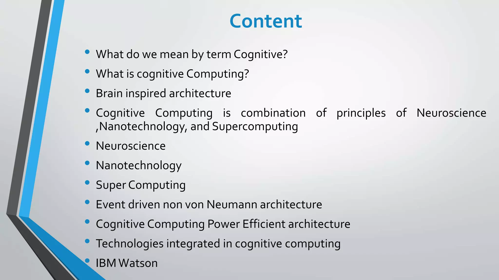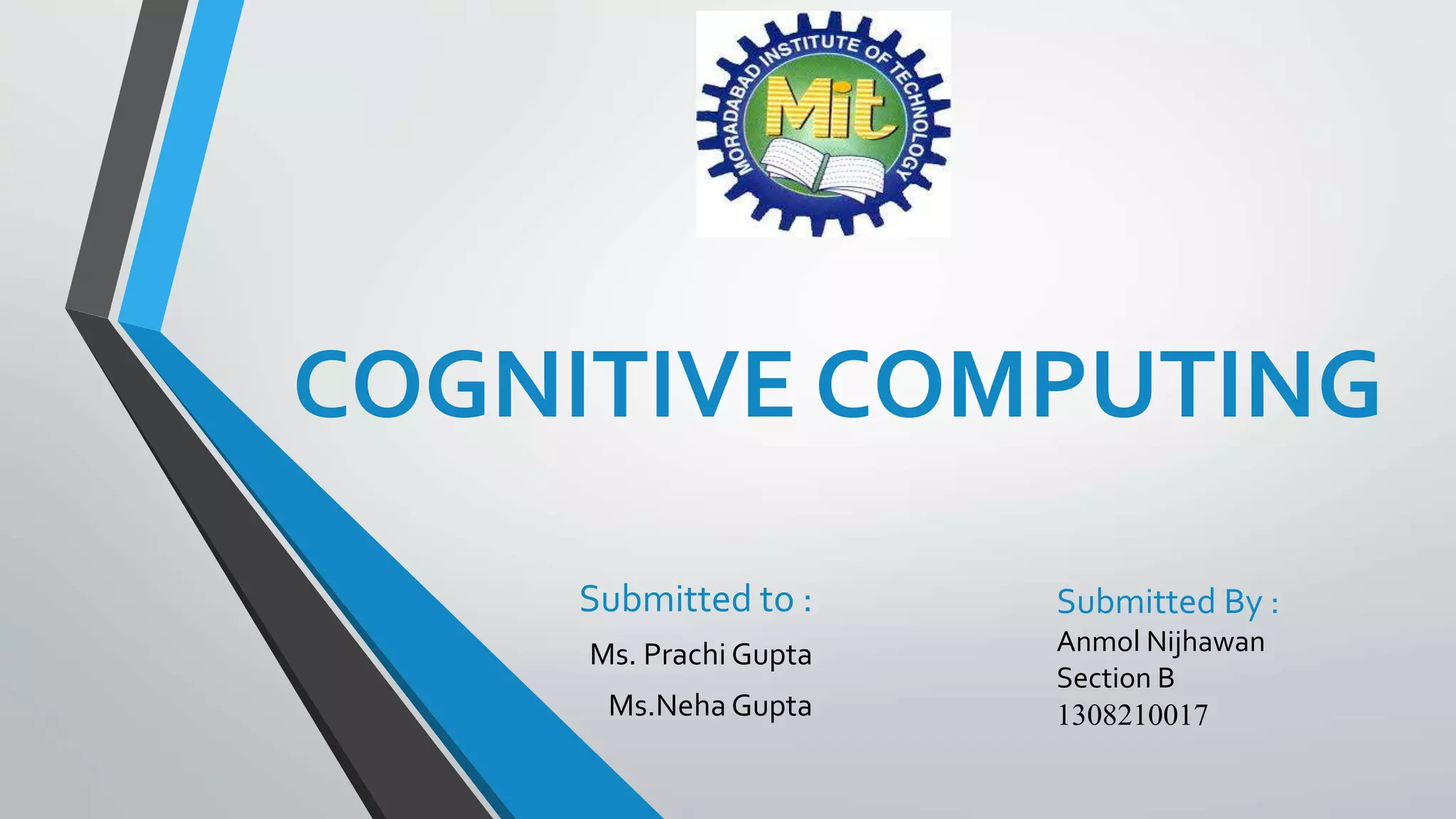 The document discusses cognitive computing, which mimics human brain functions through a combination of neuroscience, nanotechnology, and supercomputing. It highlights the brain-inspired architecture of cognitive devices, including IBM's neurosynaptic chips, and their capabilities in parallel computing, data mining, machine learning, and natural language processing. The conclusion emphasizes the importance of cognitive computing for future decision-making and data management across various professional fields.