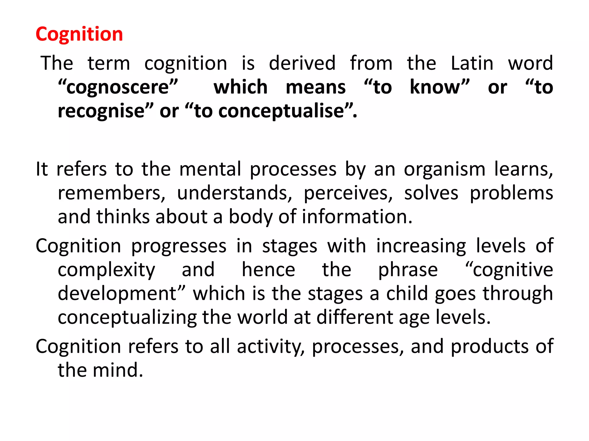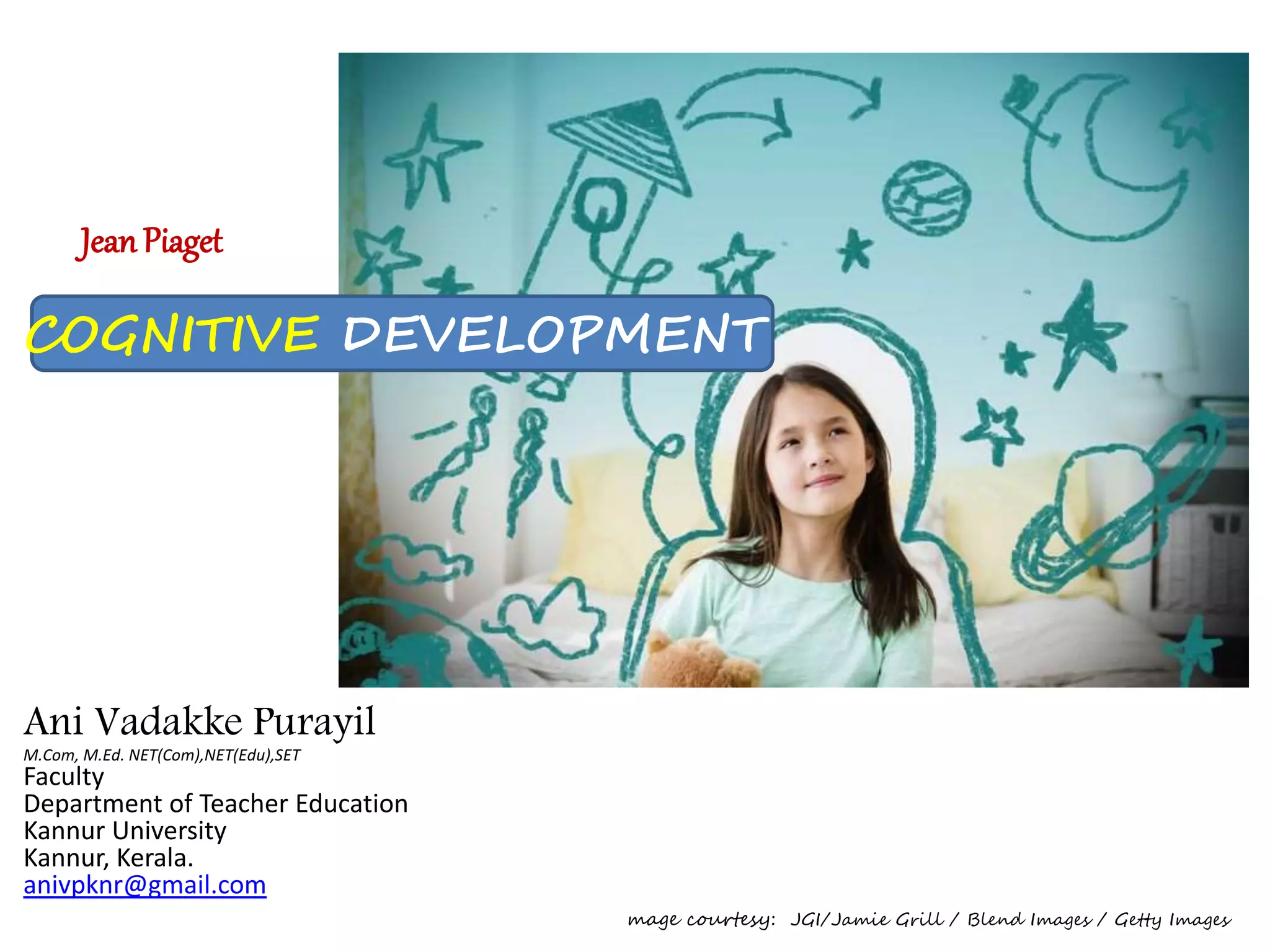 This document provides an overview of Jean Piaget's theory of cognitive development. It discusses Piaget's key concepts including schemas, assimilation, accommodation, equilibration, and his four stages of cognitive development: sensorimotor, preoperational, concrete operational, and formal operational. The sensorimotor stage involves developing object permanence through sensory experiences and motor skills. In the preoperational stage, children use symbols and language but cannot yet use logic. During the concrete operational stage, children develop logical thought processes.
