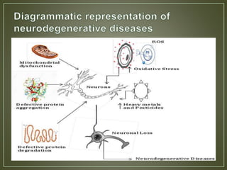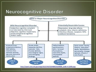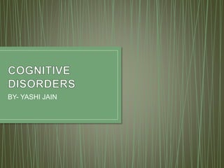 This document discusses various cognitive disorders including delirium, dementia, and amnestic disorder. Delirium is a temporary mental state causing confusion and hallucinations that may be caused by toxins, surgery, or infections. Dementia causes long-term decline in thinking abilities and is more common in females, potentially caused by conditions like Alzheimer's. Amnestic disorder involves memory deficits from brain damage or diseases like head trauma. The document also answers questions about neurogenesis, the effects of coffee on Alzheimer's risk, how drugs produce pleasure, and the proteins involved in Alzheimer's.