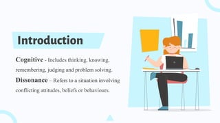 The document discusses cognitive dissonance theory as presented by a group of authors, highlighting mental discomfort resulting from conflicting attitudes, beliefs, or behaviors. It outlines methods for resolving cognitive dissonance, such as changing existing beliefs, adding new beliefs, or reducing the importance of the original belief. Examples and experiments illustrate the principles of the theory, along with its implications in contexts like decision-making and behavior modification.