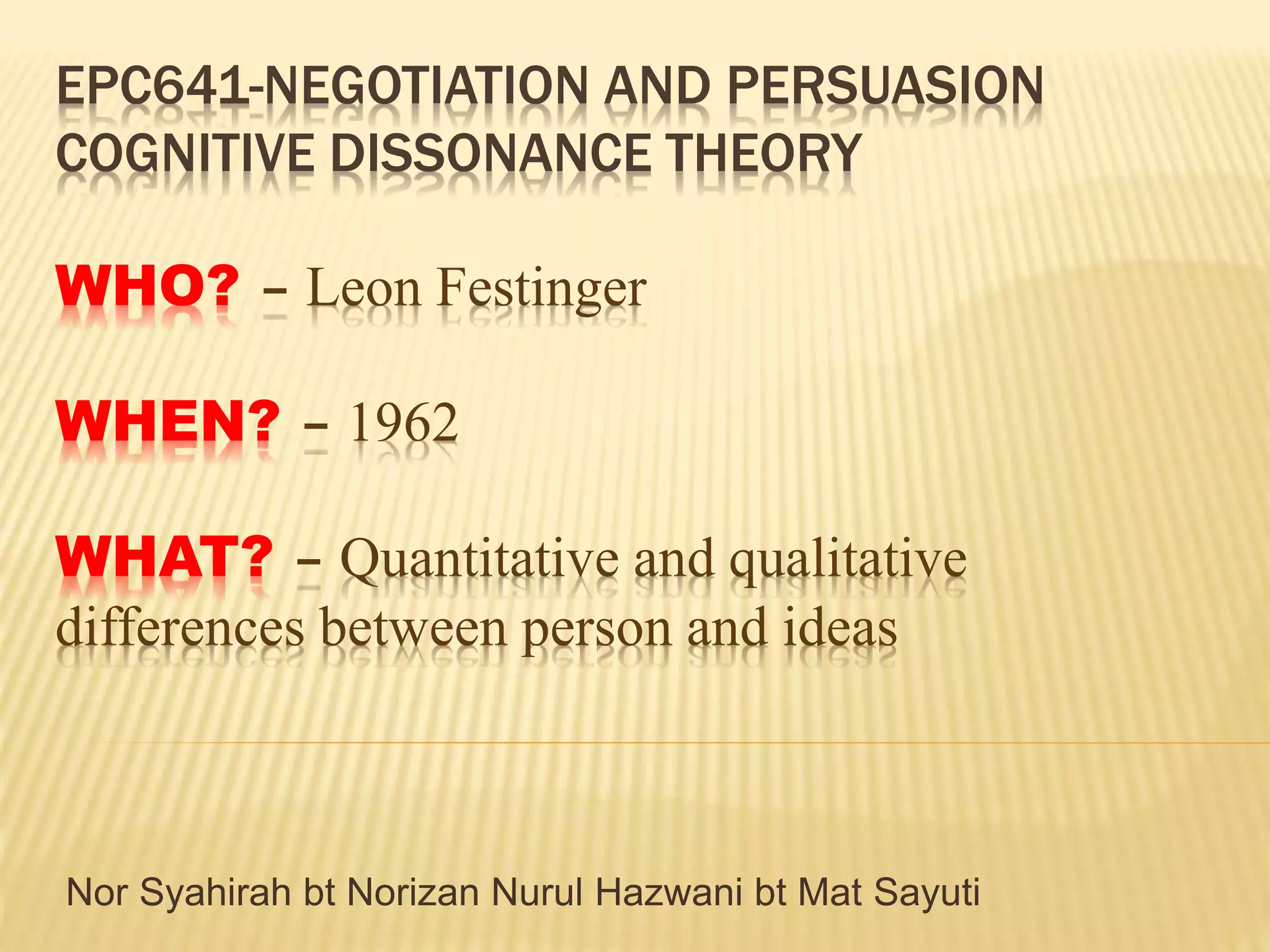 Cognitive dissonance theory developed by Leon Festinger in 1962 posits that people experience psychological tension from inconsistencies between their attitudes, beliefs, values, and behaviors, and they are motivated to reduce this tension and align their attitudes and behaviors. The theory suggests that when faced with conflicting ideas, people will change their attitudes or behaviors to reduce dissonance rather than addressing the underlying tensions.