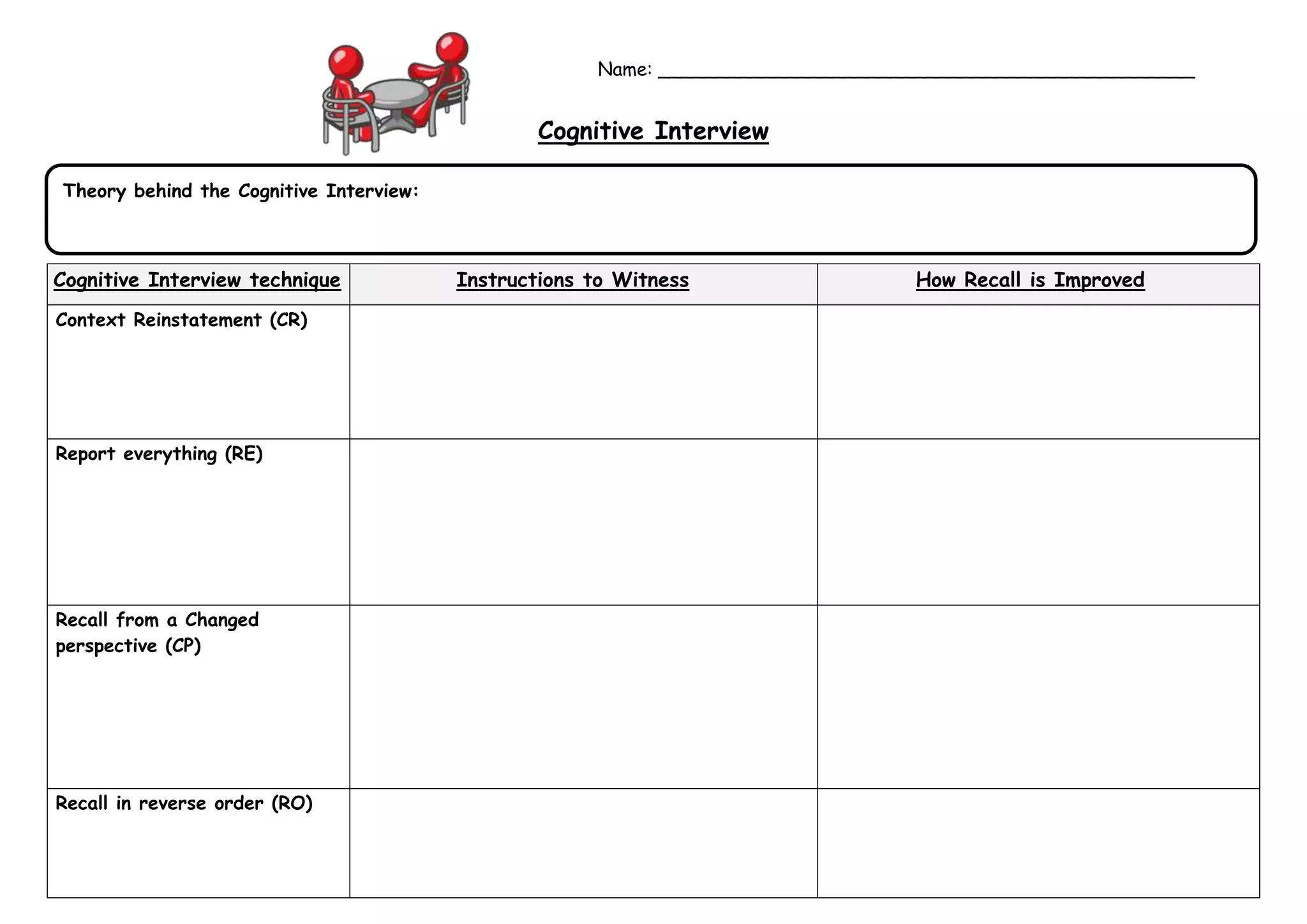 The cognitive interview technique aims to improve eyewitness recall through four methods: context reinstatement, reporting everything, recalling from a changed perspective, and recalling events in reverse order. These methods are intended to contextualize memories and access different retrieval paths to generate more comprehensive recall than a typical interview. The document also provides instructions for witnesses and discusses how the cognitive interview framework enhances memory retrieval.