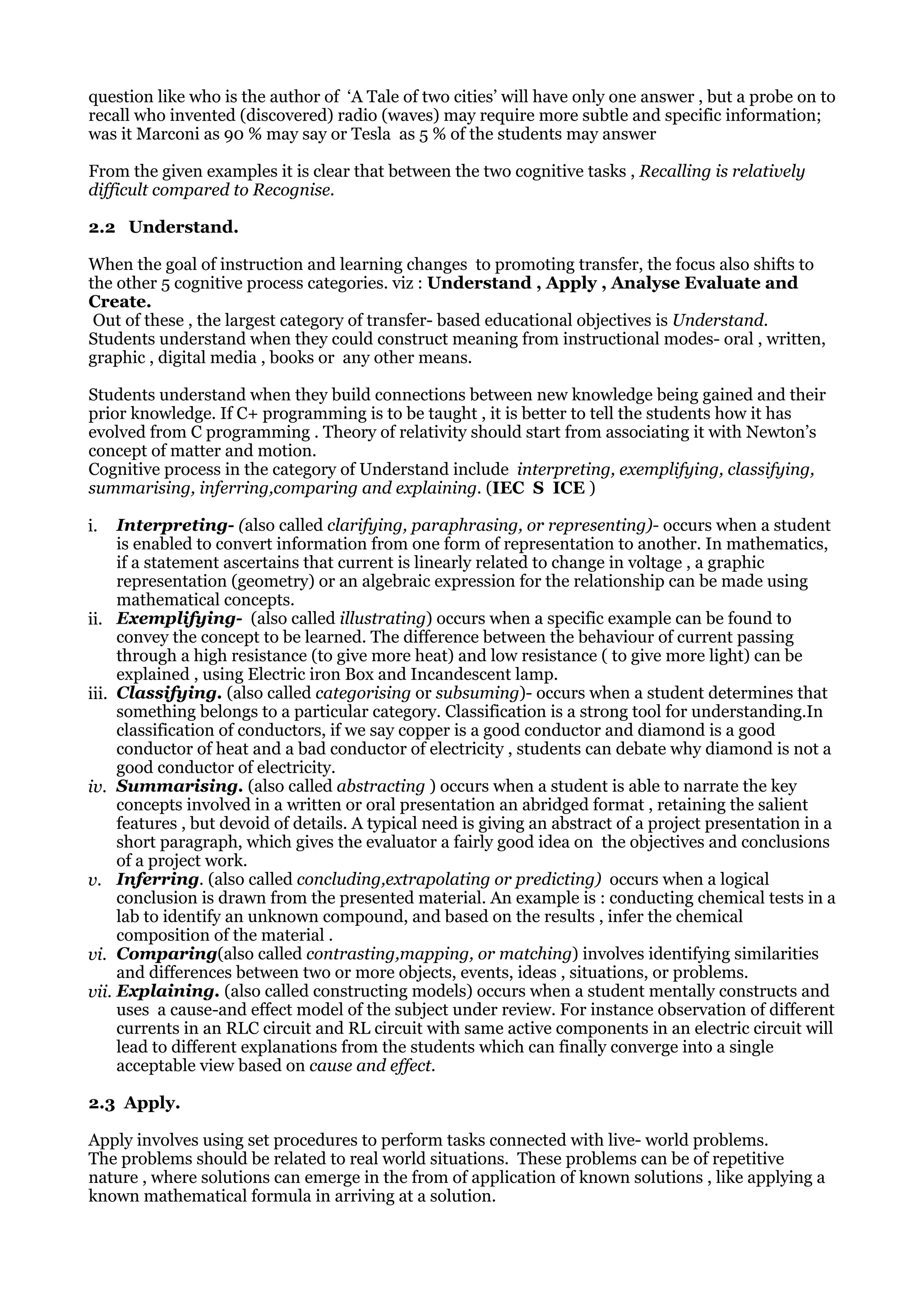 The document discusses how the revised Bloom's Taxonomy (RBT) promotes meaningful learning beyond just knowledge acquisition. RBT includes six cognitive process categories that move from retention to transfer of knowledge: Remember, Understand, Apply, Analyze, Evaluate, and Create. These categories represent a fuller range of cognitive processes compared to just focusing on memorization. The goal of education should be both retention of material as well as transfer of knowledge to new situations. RBT helps teachers foster learning objectives and assessments that promote both retention and transfer.