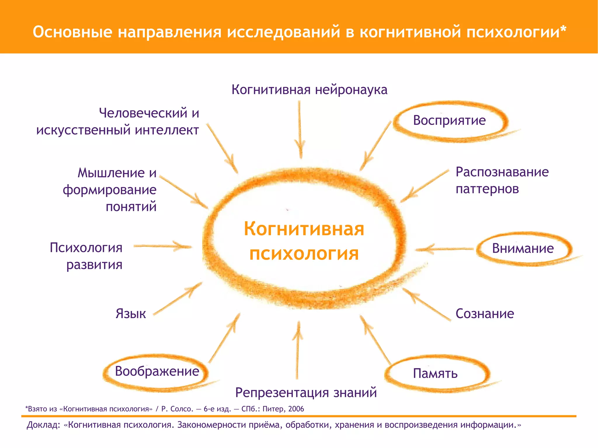 Документ охватывает основные направления исследований в когнитивной психологии, включая восприятие, внимание, память и различные аспекты когнитивной нейронауки. Он содержит ключевые термины и концепции, такие как перцепция, память и модели обработки информации. Также представлены эксперименты и теории, которые иллюстрируют принципы и закономерности когнитивных процессов.