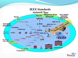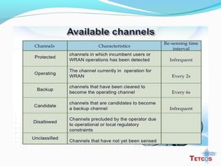 The document discusses the IEEE 802.22 standard for cognitive radio wireless regional area networks (WRANs). It describes how cognitive radio technology can help address the spectrum crunch by efficiently utilizing vacant TV bands and other licensed spectrum. The standard defines the MAC and PHY layer specifications for a cognitive radio system, including spectrum sensing, mobility, sharing, and a superframe structure to manage communication in available TV channels while avoiding interference with primary users. The goal is to provide wireless connectivity over distances of up to 30 km using the cognitive radio capabilities defined in the 802.22 standard.