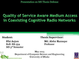 The document appears to be a student thesis that discusses medium access control (MAC) protocols for coexisting cognitive radio networks (CCRNs). It proposes a new distributed and quality of service aware MAC protocol called WF-MAC. WF-MAC aims to enable fair channel sharing among multiple CCRNs while maintaining QoS sensitivity and maximizing spectrum utilization. It achieves this through a two dimensional learning mechanism for channel selection based on perception and availability prediction.