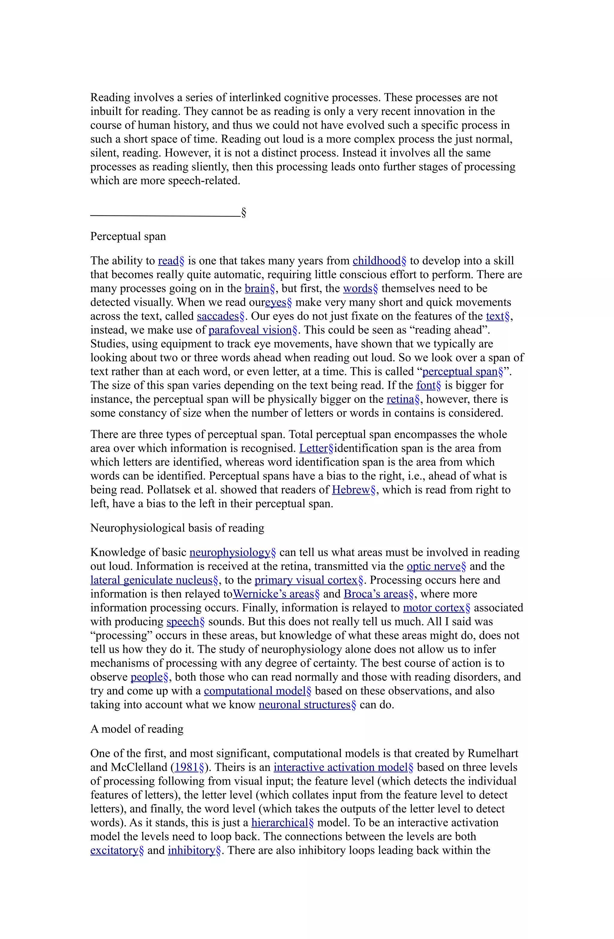 This document summarizes the cognitive processes involved in reading aloud versus silent reading. It discusses that reading involves interconnected cognitive processes that take years to develop and allow our eyes to perceive words ahead in a text. It then describes a computational model of reading proposed by Rumelhart and McClelland involving feature, letter, and word levels that interact via excitation and inhibition. The model was later developed to account for priming effects by introducing synaptic strengthening. Finally, the document outlines three possible cognitive routes from visual word analysis to speech production when reading aloud.