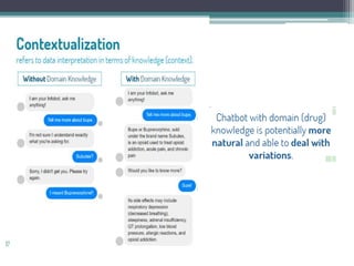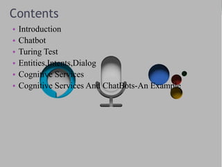 The document discusses a seminar on AI and chatbots led by Veena S. Kumar, covering topics such as the Turing Test and cognitive services in AI. It explains the evolution of chatbots as AI-driven conversational agents and details their functionality involving intents, entities, and utterances. Additionally, the document highlights the integration of cognitive services with chatbots through examples like Kbot, showcasing advancements in natural language processing and machine learning.