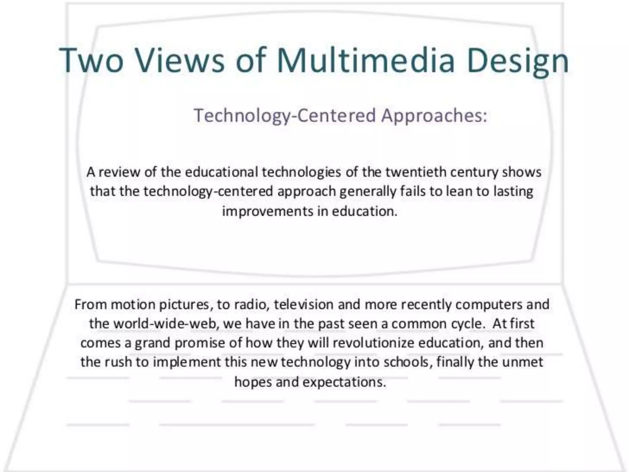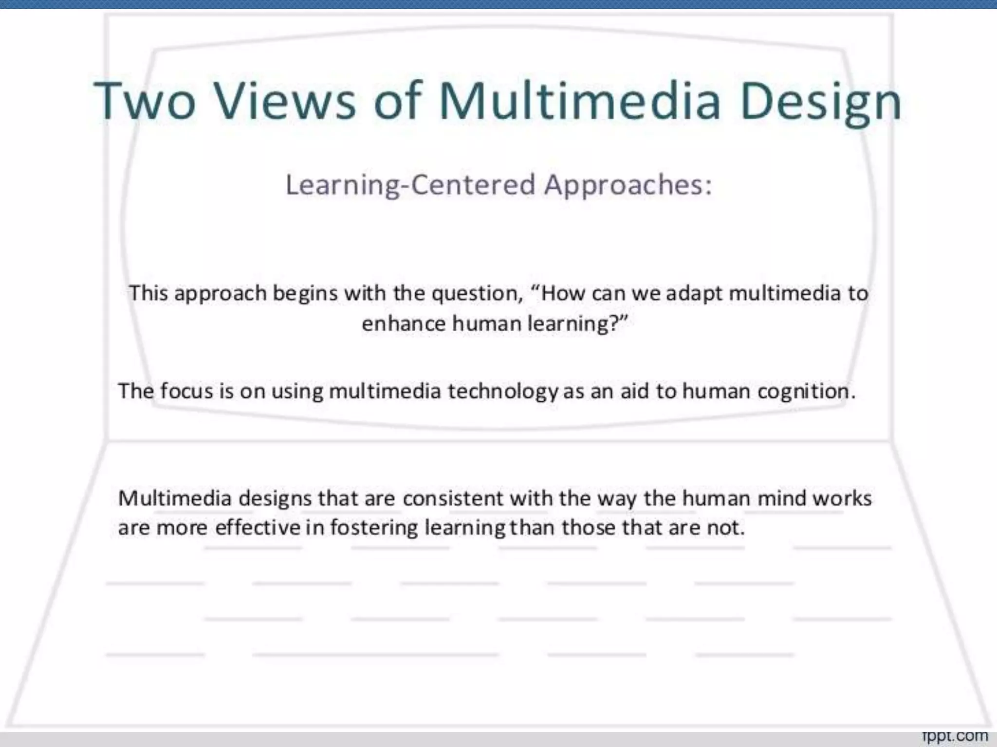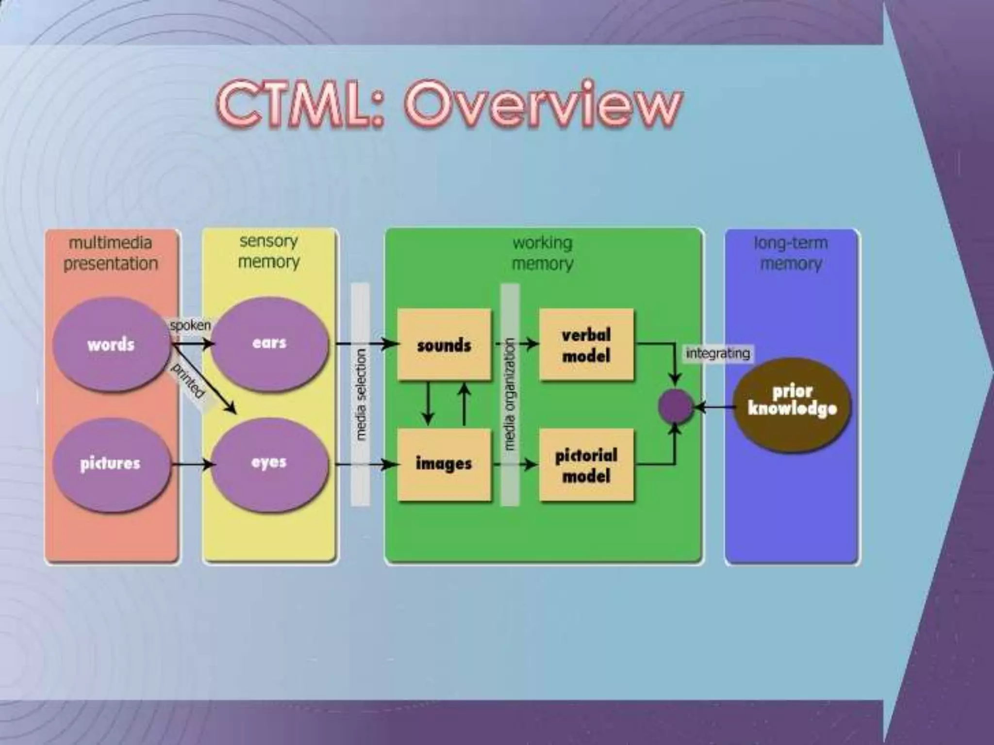 The document discusses the cognitive theory of multimedia learning. It states that according to this theory, people learn better from words and images than from words alone. The theory is based on the assumptions that people process visual and verbal information differently, have limited working memory capacity, and actively process information. Effective multimedia instruction follows principles such as coherence, redundancy, spatial contiguity, temporal contiguity, and modality to help learners select, organize and integrate information into long-term memory.