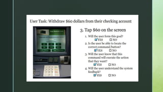 A cognitive walkthrough is a usability evaluation method that involves walking through tasks to evaluate if a user will be able to understand how to complete them based on four questions: 1) Will users try the right action? 2) Will they notice the correct option? 3) Will they associate the action with the expected outcome? 4) Will they know progress is being made? It focuses on the perspective of a first-time user and identifies any issues with the user interface without testing actual users.