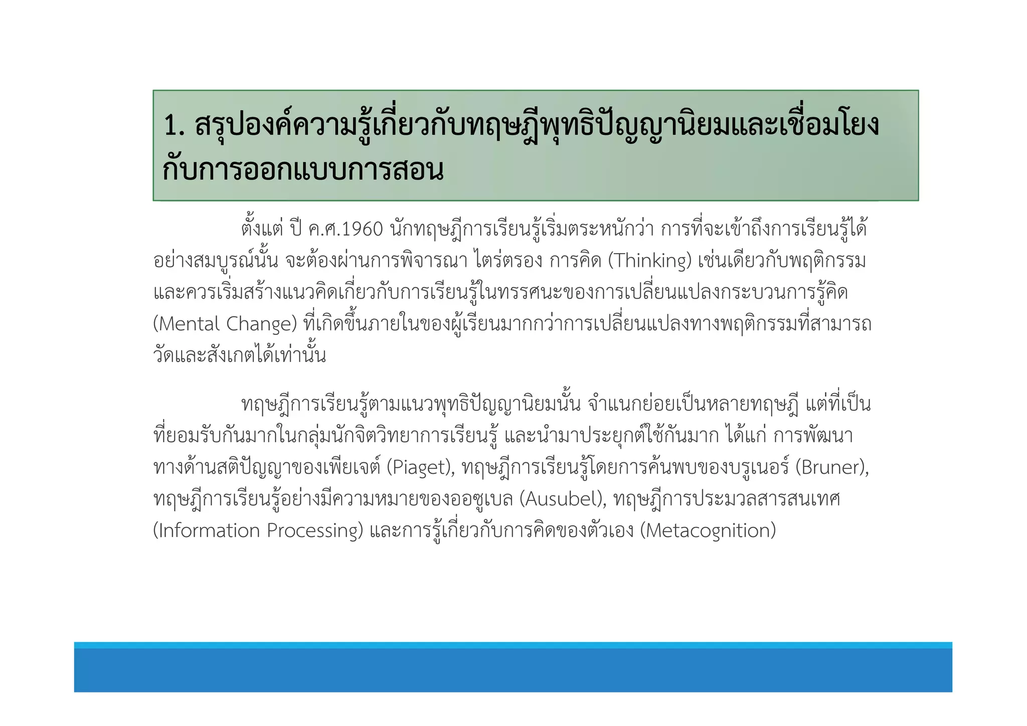 1. สรุปองคความรูเกี่ยวกับทฤษฎีพุทธิปญญานิยมและเชื่อมโยง