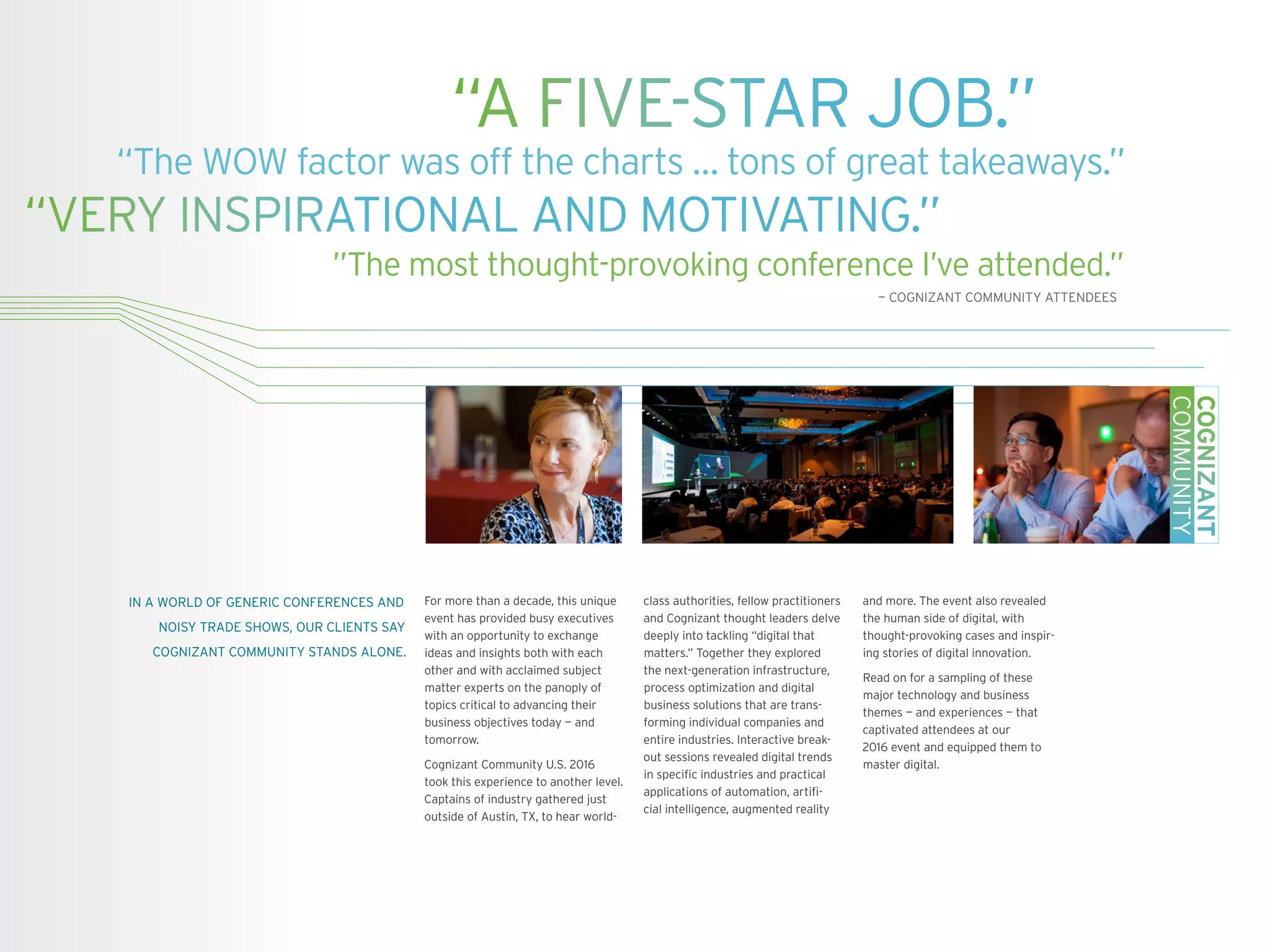 The Cognizant Community 2016 event brought together executives to discuss mastering digital transformation, featuring insights on automation, artificial intelligence, and blockchain technology. Attendees explored the blend of technology and human creativity necessary for navigating the future of digital business, emphasizing the importance of understanding customer needs and engaging with innovative strategies. Keynotes illustrated how successful digital efforts require a balance between managing existing systems and embracing new digital capabilities to drive value and competitive advantage.