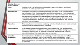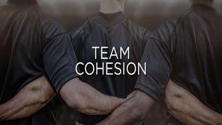 This document discusses group processes in sports psychology and coaching, with a focus on group cohesion. It defines cohesion as the tendency of a group to stick together and remain united in pursuing objectives. Cohesion has two types: task cohesion related to achieving goals, and social cohesion regarding liking each other. Several tools measure cohesion directly by asking about attraction, or indirectly by assessing relationships. High cohesion relates to better performance. Strategies to enhance cohesion include open communication, trust-building, conflict resolution, feedback, fun team activities, and making the group feel exclusive.