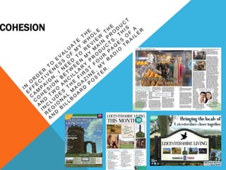 The document discusses how a billboard poster, magazine, and radio advertisement work together in a cohesive marketing campaign. Key points of cohesion include using the same images, fonts, and references to social media across the materials. The goal is to create a sense of local pride and community among residents of Leicestershire by highlighting landmarks and events. Consistency of messaging across different media helps reinforce the brand and campaign messaging to the target audience.