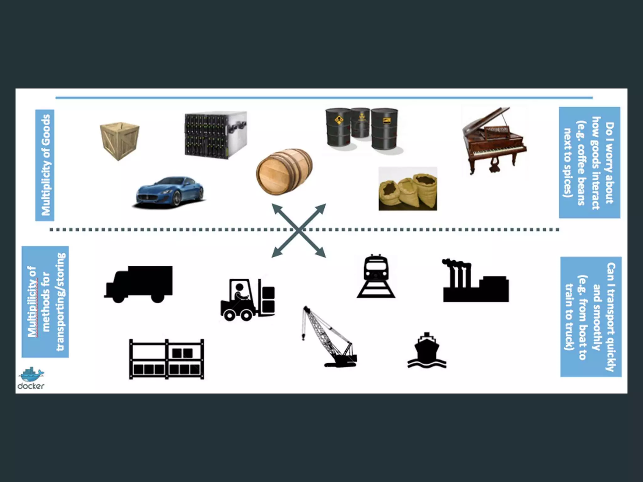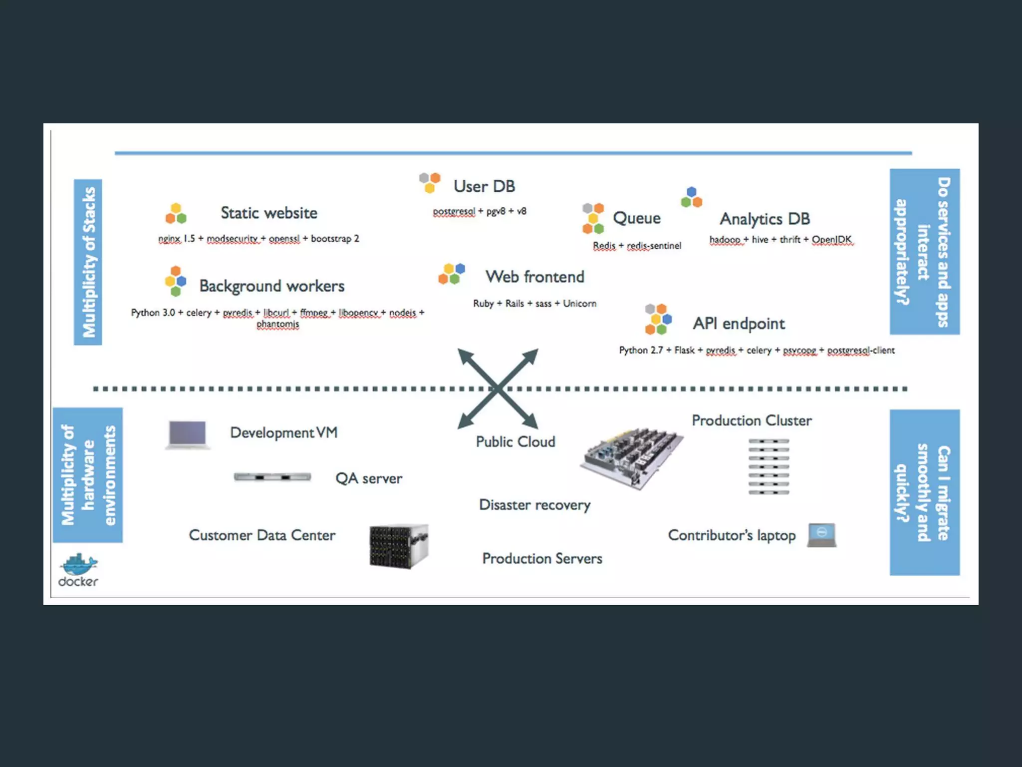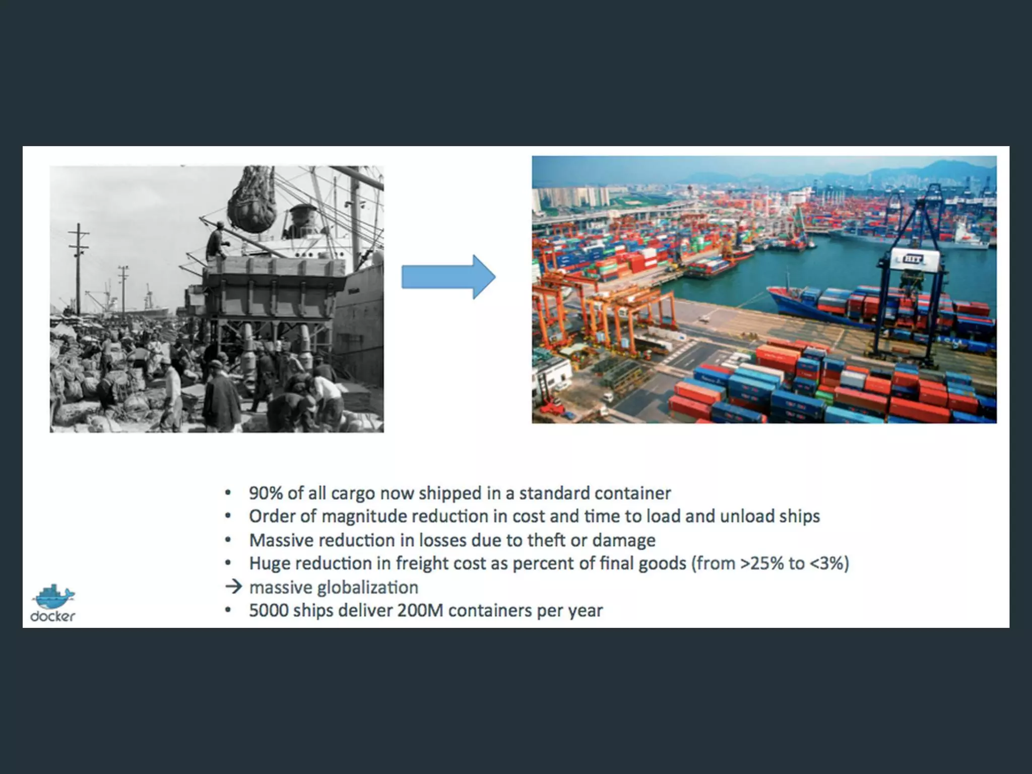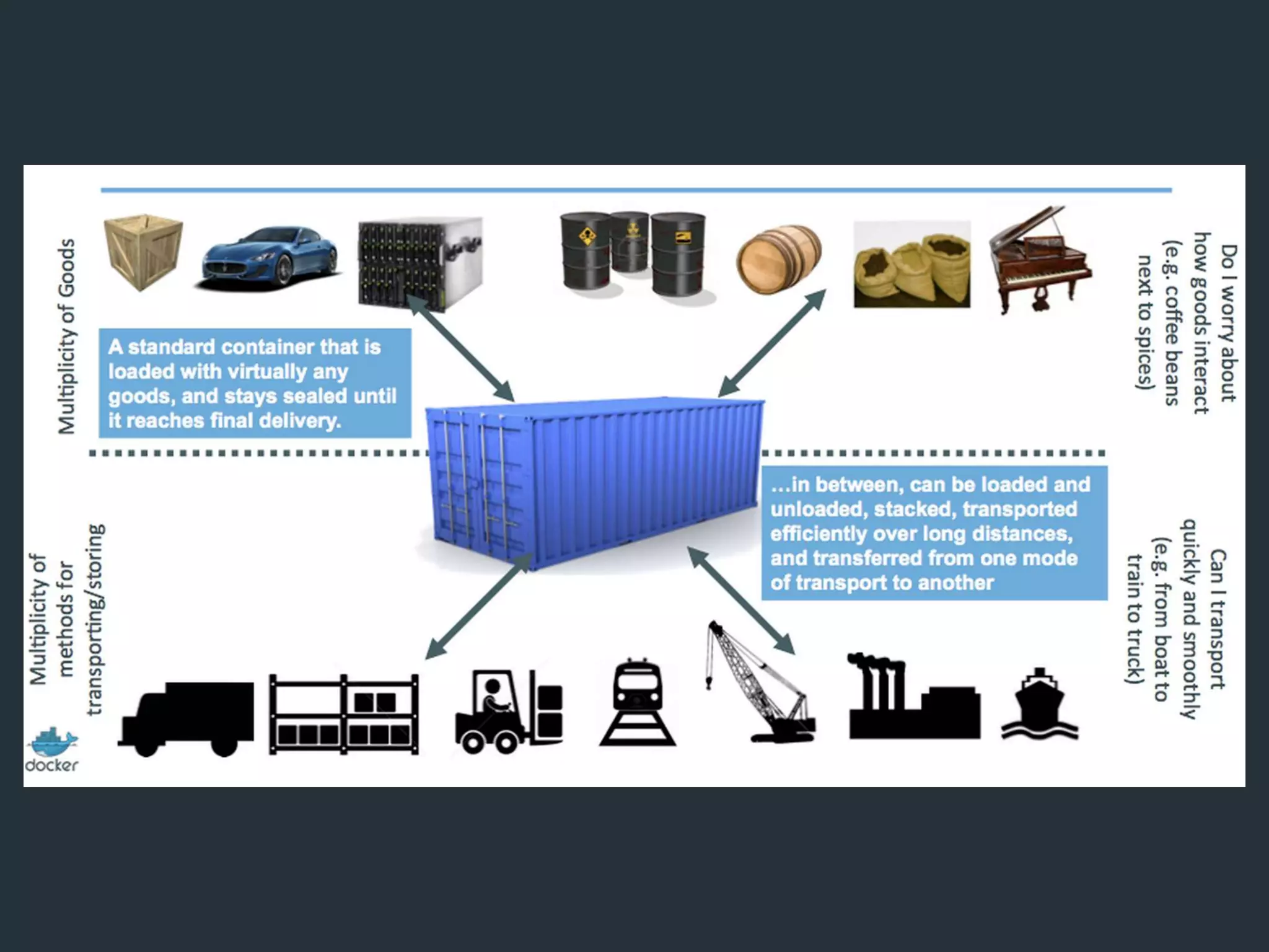 This document summarizes a presentation about Docker. It discusses why Docker is useful for cloud computing, how it aims to reduce the time between writing code and deploying it, and how Docker is now widely used without much notice. It then covers topics like the difference between Docker images and containers, building Dockerfiles, linking and networking containers, logging inspection, the Docker Hub registry, and orchestration tools like Docker Machine, Swarm and Compose. The presentation highlights pros like standardized deployments and easy DevOps workflows, and cons like complexity and a rapidly evolving ecosystem.