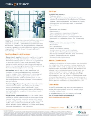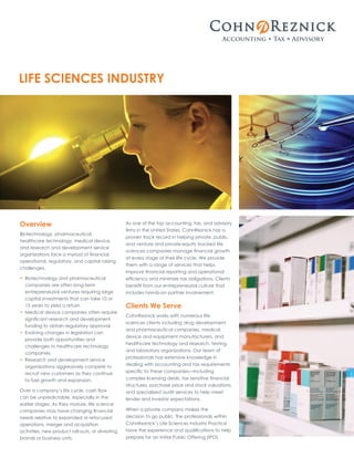 CohnReznick LLP specializes in providing accounting, tax, and advisory services to life sciences companies facing financial, operational, and regulatory challenges. Their expertise includes IPO preparation, audit services, and tax planning, tailored to the unique needs of biotechnology, pharmaceutical, and medical device firms. With a broad national reach and deep industry knowledge, they help clients navigate complex accounting issues and optimize financial growth throughout their lifecycle.