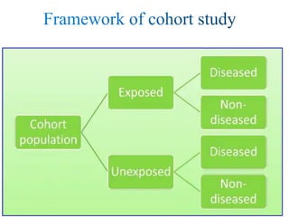 This document provides an overview of cohort studies. It defines a cohort study as observing a group of people who share a common characteristic or experience over time to study the frequency of disease. The key features discussed include: identifying cohorts prior to disease, observing cohorts prospectively to study cause-effect relationships, minimizing attrition, and comparing exposed and non-exposed groups. The document also covers types of cohort studies, elements of cohort studies like follow-up, and strengths such as establishing causation but also weaknesses like loss to follow-up.
