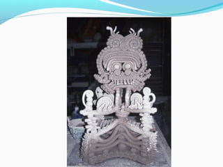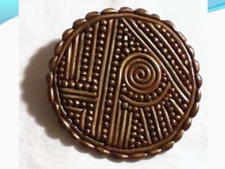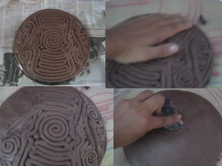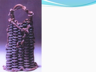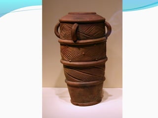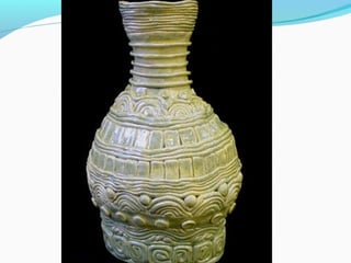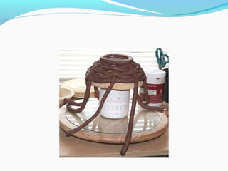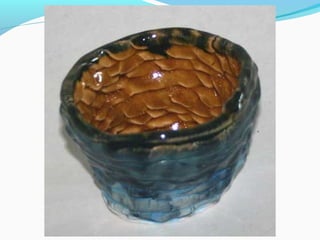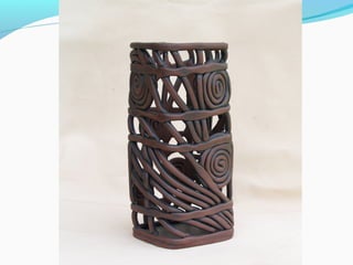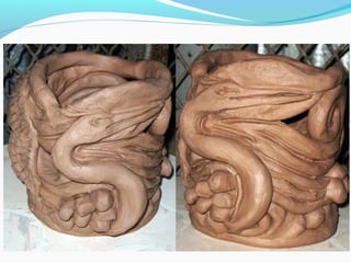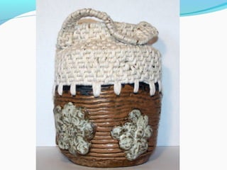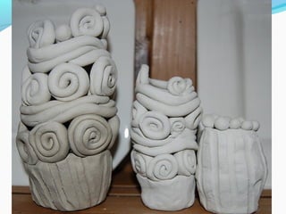 Coil pots have been made for over 10,000 years and were some of the earliest forms of storage containers. The document discusses various coil pot techniques such as rolling coils, scoring coils before attaching them, and decorating coils by intertwining them or shaping them into teardrops. Coils can be sculpted into designs, images, or parts of animals and then smoothed or left visible in the finished pot.