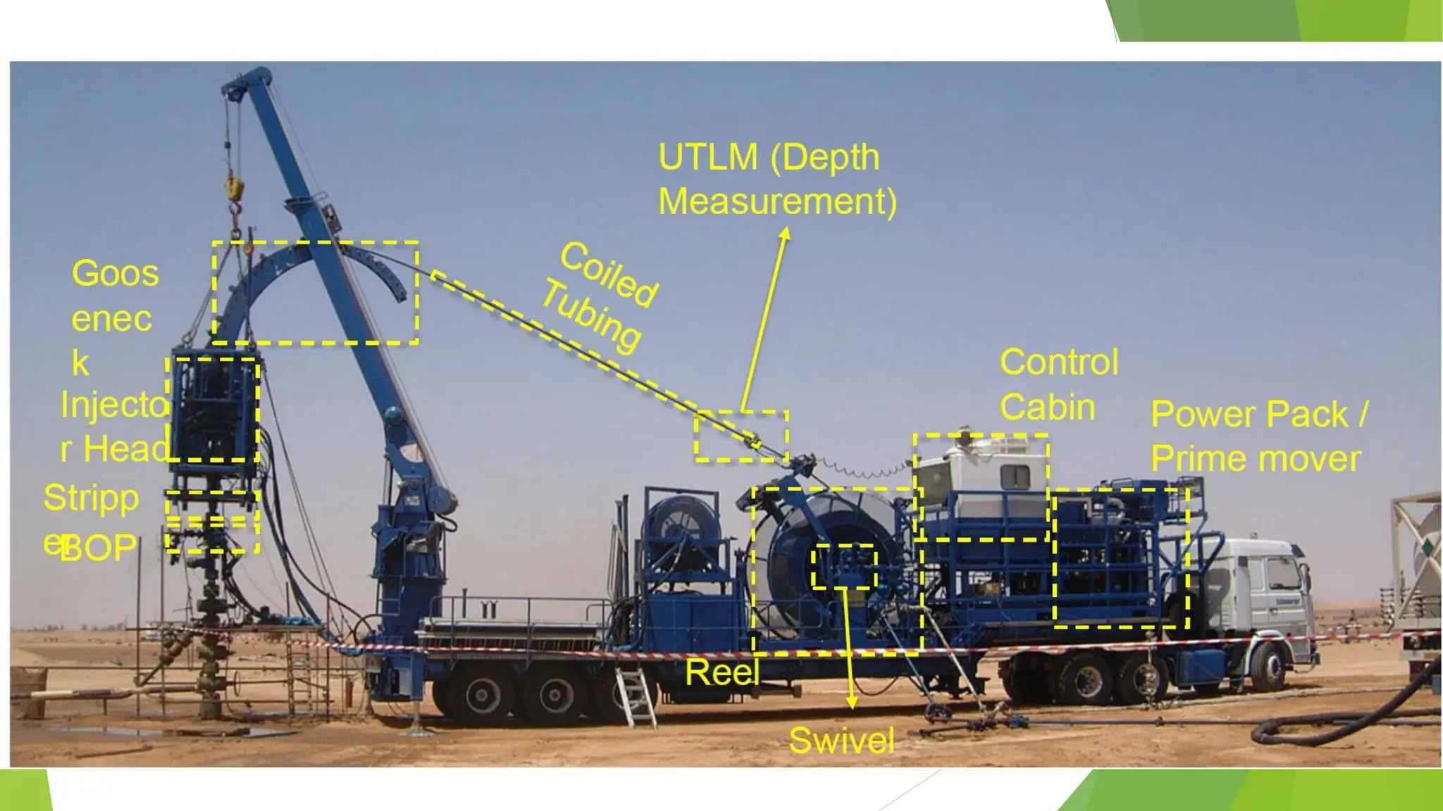 the reel, control cabin, power pack and BOP. A smaller crane truck is used to