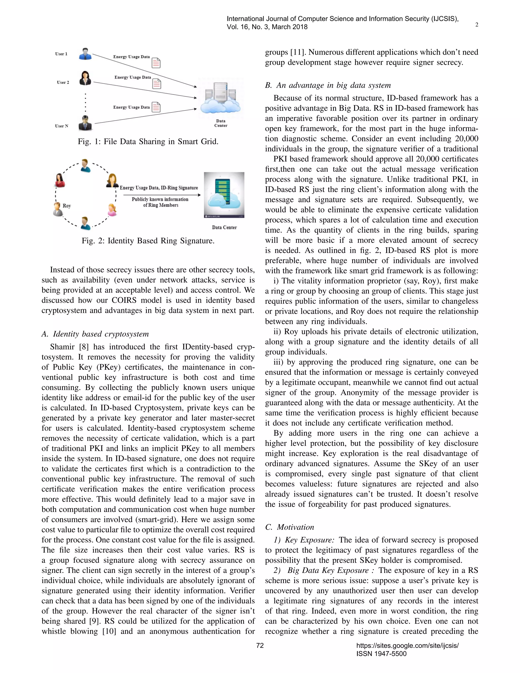 The document introduces the Cost Optimized Identity based Ring Signature (COIRS) framework designed for data sharing in cloud computing, emphasizing its ability to enhance authenticity, anonymity, and efficiency while reducing costs. By eliminating traditional certificate verification processes, COIRS allows for more streamlined and economically feasible data sharing among groups, while providing forward secrecy to protect past signatures even if the current key is compromised. The paper discusses the framework's advantages in smart grid applications and outlines its architecture and mathematical assumptions.