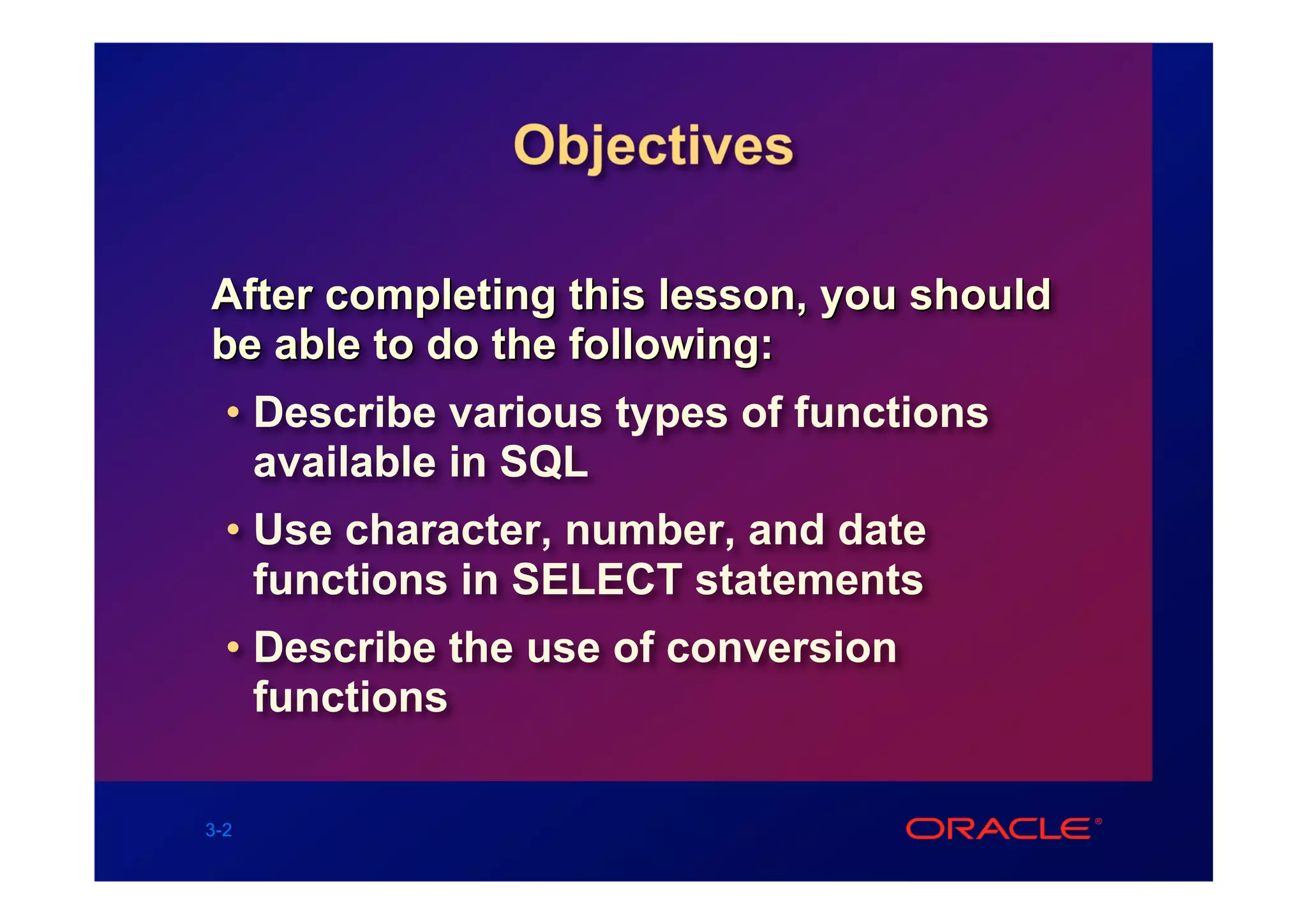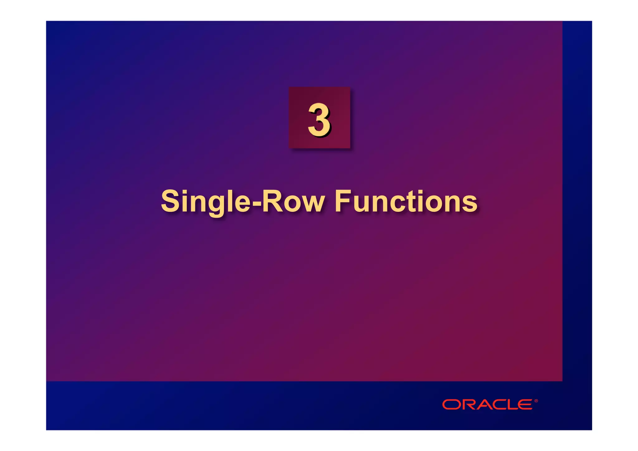 Single-row functions in SQL allow users to manipulate data within individual rows and return a single result per row. This document describes different types of single-row functions including character, number, date, and conversion functions. It provides examples of how to use functions like UPPER, ROUND, ADD_MONTHS, TO_CHAR, and NVL to modify, format, and convert data as needed for SELECT statements. Nesting functions allows multiple operations to be performed sequentially on a data element.