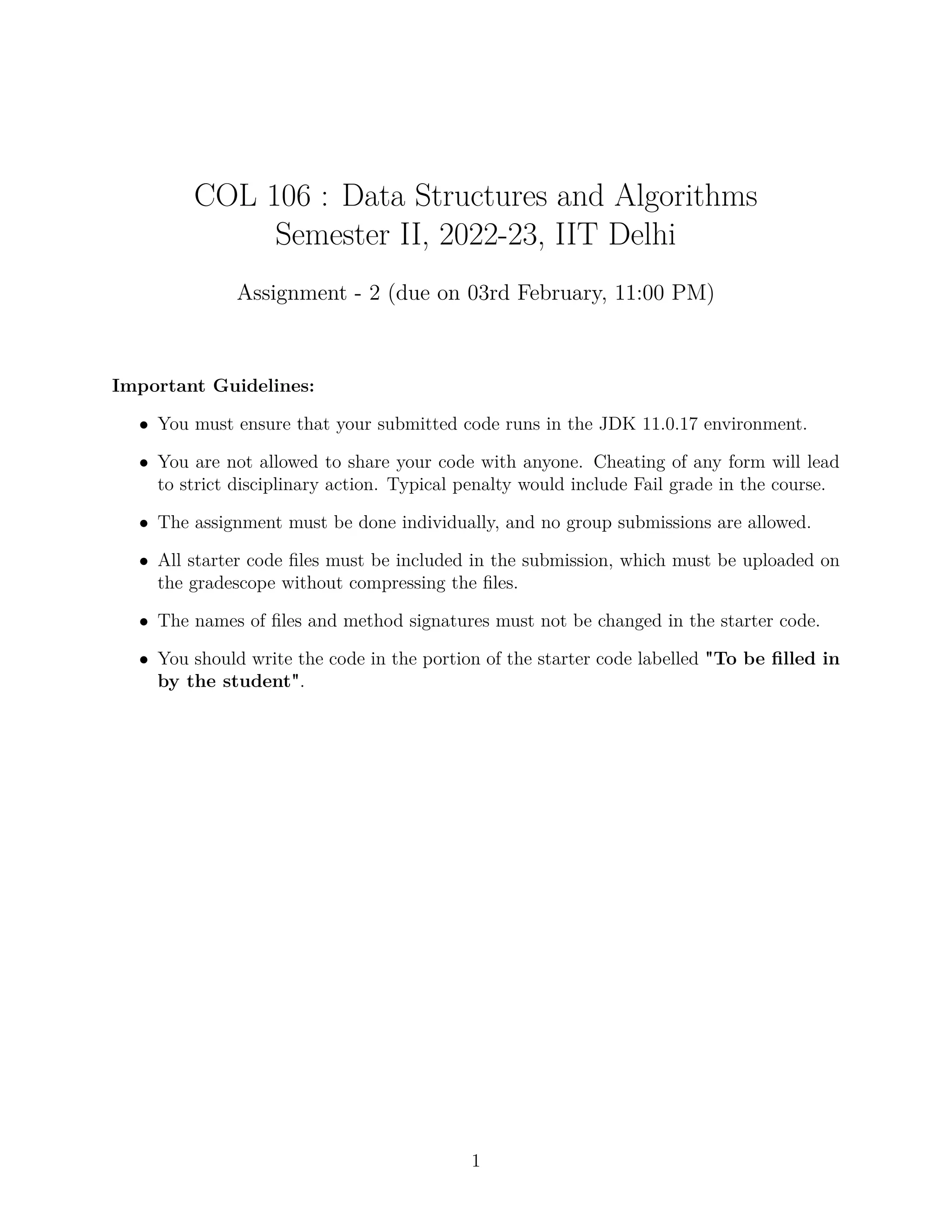 This document provides guidelines and instructions for Assignment 2 of COL 106: Data Structures and Algorithms course. It discusses important points regarding code submission such as ensuring code runs on JDK 11.0.17, avoiding sharing code or cheating which could lead to fail grade, and submitting individual work. It then describes implementing polynomial operations using linked lists, including creating a linked list to represent polynomials, and adding and multiplying polynomials. Finally, it discusses implementing a dictionary using a hash table and linked lists, performing frequency analysis on text by storing word frequencies in dictionaries, and analyzing dictionary performance.
