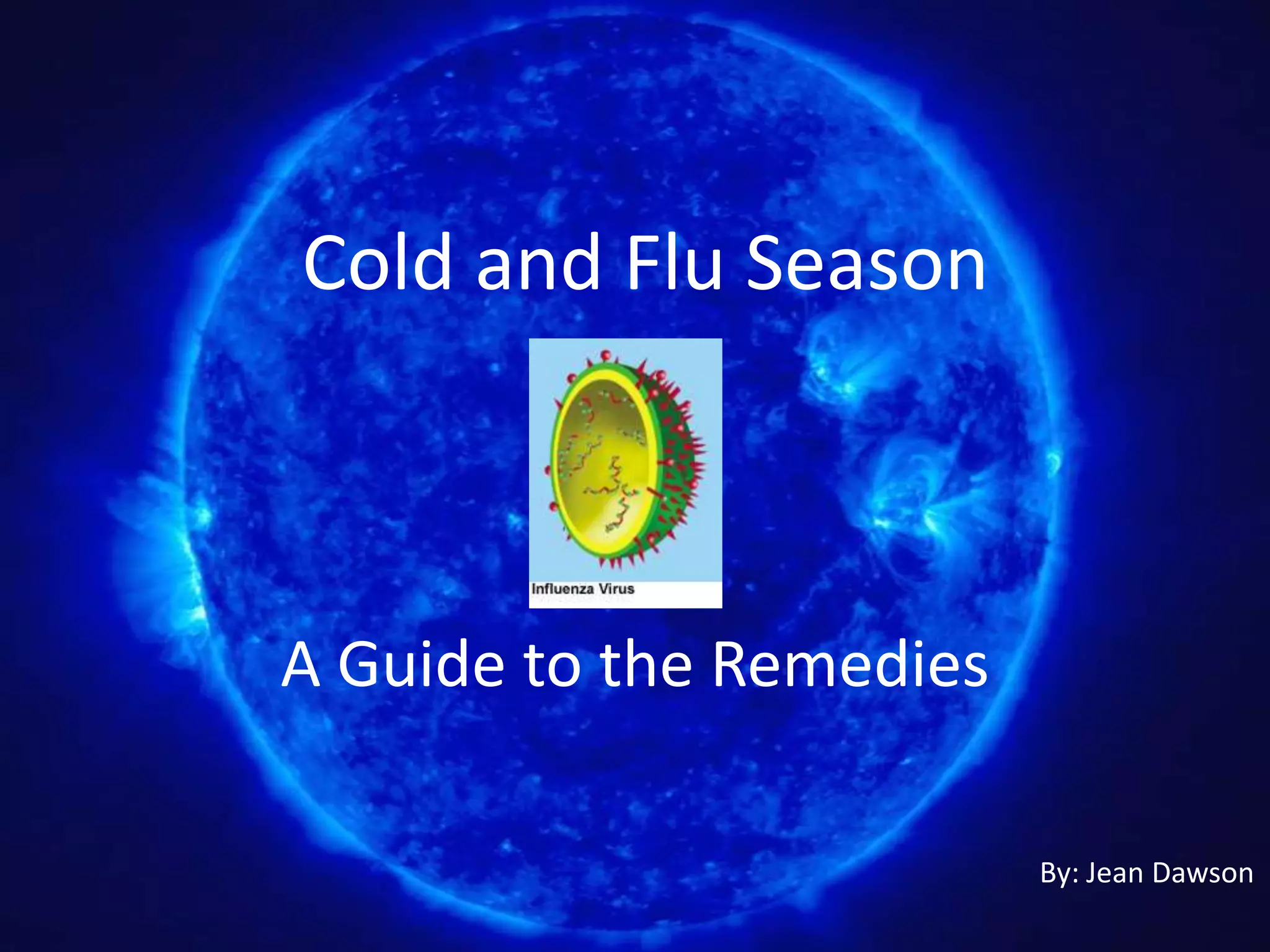 This document provides a guide to natural remedies for cold and flu, highlighting various useful herbs, foods, and supplements that can help alleviate symptoms. It includes specific recipes for horehound candy and catnip tea, as well as recommendations for mixing herbs for cold and flu symptoms. The information is educational and emphasizes the importance of consulting a healthcare professional for proper diagnosis and treatment.