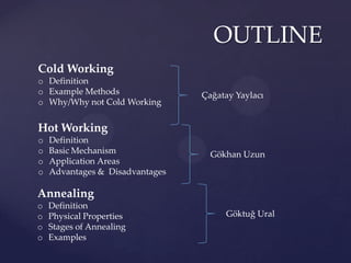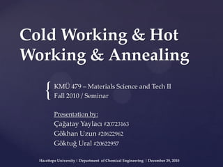 The document discusses cold working, hot working, and annealing processes for metals. Cold working involves plastic deformation at low temperatures to increase strength but reduce ductility through dislocation formation. Hot working above recrystallization temperatures can reduce imperfections through atomic mobility. Annealing heats metals slowly to allow recovery and recrystallization, reducing dislocations and improving properties like ductility. Examples of each process and their advantages/disadvantages are provided.