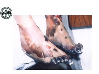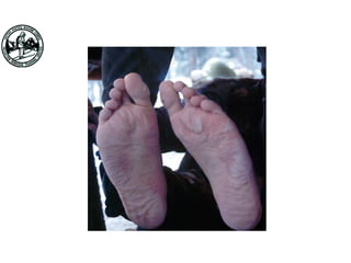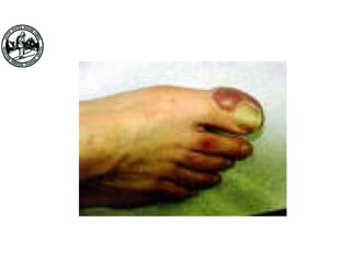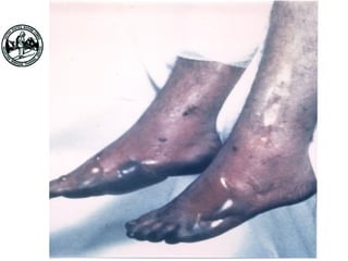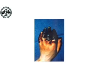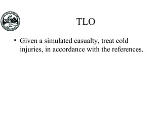 Frostbite and immersion foot are cold injuries caused by prolonged exposure to wet and cold conditions. Frostbite results from actual freezing of tissue and causes numbness, pain, blistering and tissue death. Treatment involves rapid rewarming in warm water followed by pain medication and wound care. Immersion foot occurs in wet, non-freezing environments and causes swelling, blistering and nerve damage. Prevention of both injuries focuses on keeping skin dry and body insulated through proper clothing, activity, hydration and avoiding nicotine use.