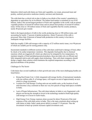 This document discusses the cold chain infrastructure in India. It provides context on the importance of cold chains for industries like fruits, vegetables, dairy, and pharmaceuticals. It outlines the key components of cold chains including refrigerated storage and transportation. It also discusses the current state and challenges of the cold chain sector in India, such as high costs, lack of infrastructure, and uneven capacity. Improving cold chain infrastructure is important for reducing food waste and spoilage.