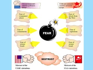 The Cold War was a period of geopolitical tension between the United States and Soviet Union from 1945 to 1991. Reasons for the Cold War included differing political ideologies between capitalism and communism, as well as distrust between the two superpowers following World War II. During the Cold War, the US and USSR engaged in proxy wars, arms races, space races, propaganda campaigns, and espionage as each sought to contain the influence and military strength of the other. The Cold War ended in the late 1980s and early 1990s with the fall of communism in Eastern Europe and dissolution of the Soviet Union.