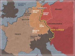 The Cold War began after World War II as tensions grew between the United States and Soviet Union. They emerged as rival superpowers with opposing political and economic ideologies of capitalism versus communism. This led to a long period of geopolitical tension and military buildup between the two nations and their respective allies that stopped short of direct armed conflict. Key events during the Cold War included the Marshall Plan and NATO helping rebuild and defend Western Europe, the division of Germany and Berlin, and escalating arms races and proxy wars. The space race and Cuban Missile Crisis heightened tensions. The Cold War ended in the late 1980s as communist governments fell in Eastern Europe and the USSR dissolved.
