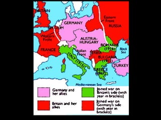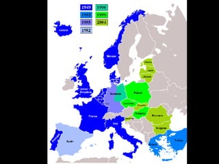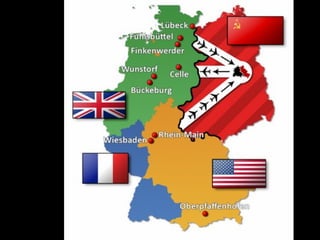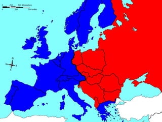 The document provides information about the origins and impact of the Cold War. It discusses how after WWII, tensions grew between the Western allies (US, UK, France) and the Soviet Union over the political and economic systems in Eastern Europe. This led to the division of Europe and Germany into capitalist and communist spheres of influence separated by the Iron Curtain. Over time, the US and USSR built up opposing military alliances (NATO and Warsaw Pact) and stockpiles of nuclear weapons in a tense standoff known as the Cold War, which impacted global politics until the Soviet Union's collapse in 1991.