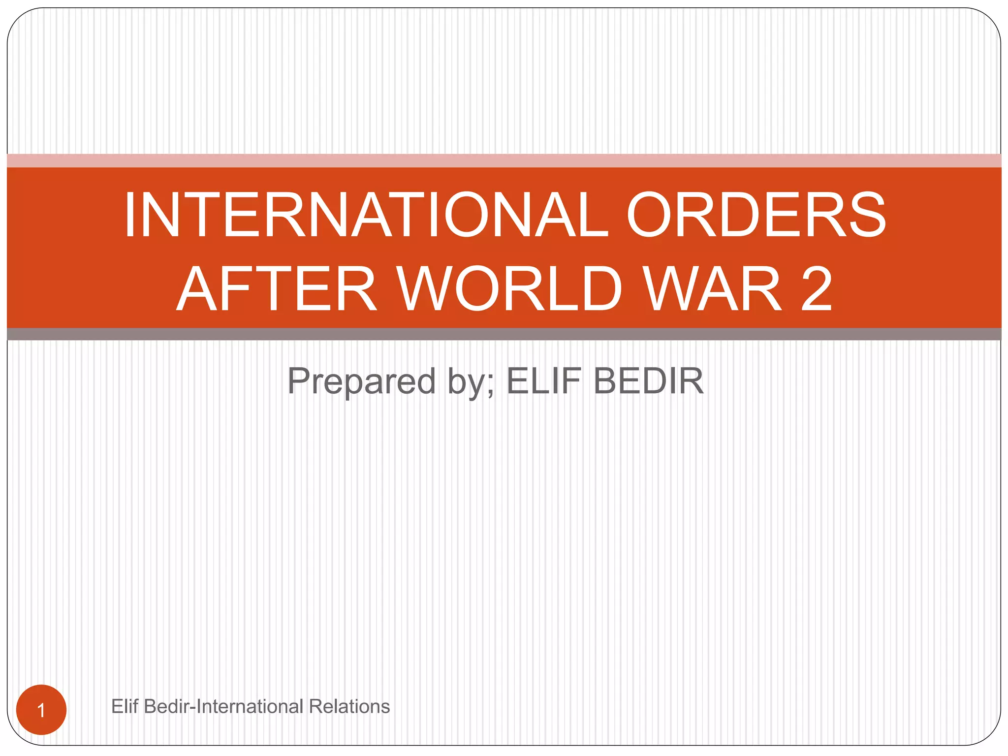 The document discusses the international order after World War 2 and the Cold War. It describes the establishment of opposing Eastern and Western blocs led by the USSR and US/NATO respectively. Key events of the Cold War included the Korean War and establishment of NATO and Warsaw Pact. Mikhail Gorbachev's 1988 UN speech introduced the concept of a "New World Order" based on cooperation between major powers and strengthening the UN's role. This post-Cold War order focused on nuclear disarmament, economic cooperation, and adherence to international law and human rights.