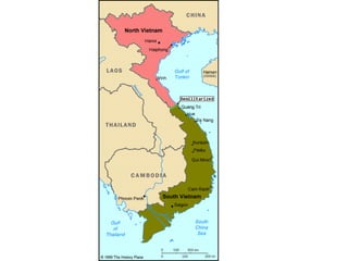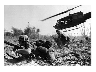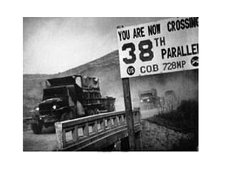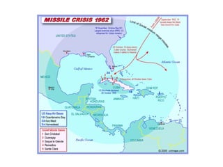 The document summarizes key events in the Cold War between the Soviet Union and the United States from 1945 to 1989. It describes how the US helped rebuild Western Europe through the Marshall Plan to prevent communist takeover after WWII. It also discusses the rise of communist China and subsequent proxy wars in Korea and Vietnam between the two superpowers. The document outlines periods of increased tensions like the Cuban Missile Crisis and periods of détente. It concludes with the fall of the Berlin Wall and collapse of the Soviet Union, marking the end of the Cold War.