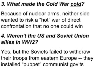 The Cold War was a period of intense rivalry between the US and Soviet Union that began after World War 2 and lasted over 40 years. Neither side engaged in direct military conflict due to nuclear weapons. The US established institutions and alliances like NATO to contain the spread of communism in Europe, while the Soviets set up communist governments in Eastern Europe behind an "Iron Curtain." This resulted in an arms race as both stockpiled nuclear weapons and a series of crises over places like Berlin.