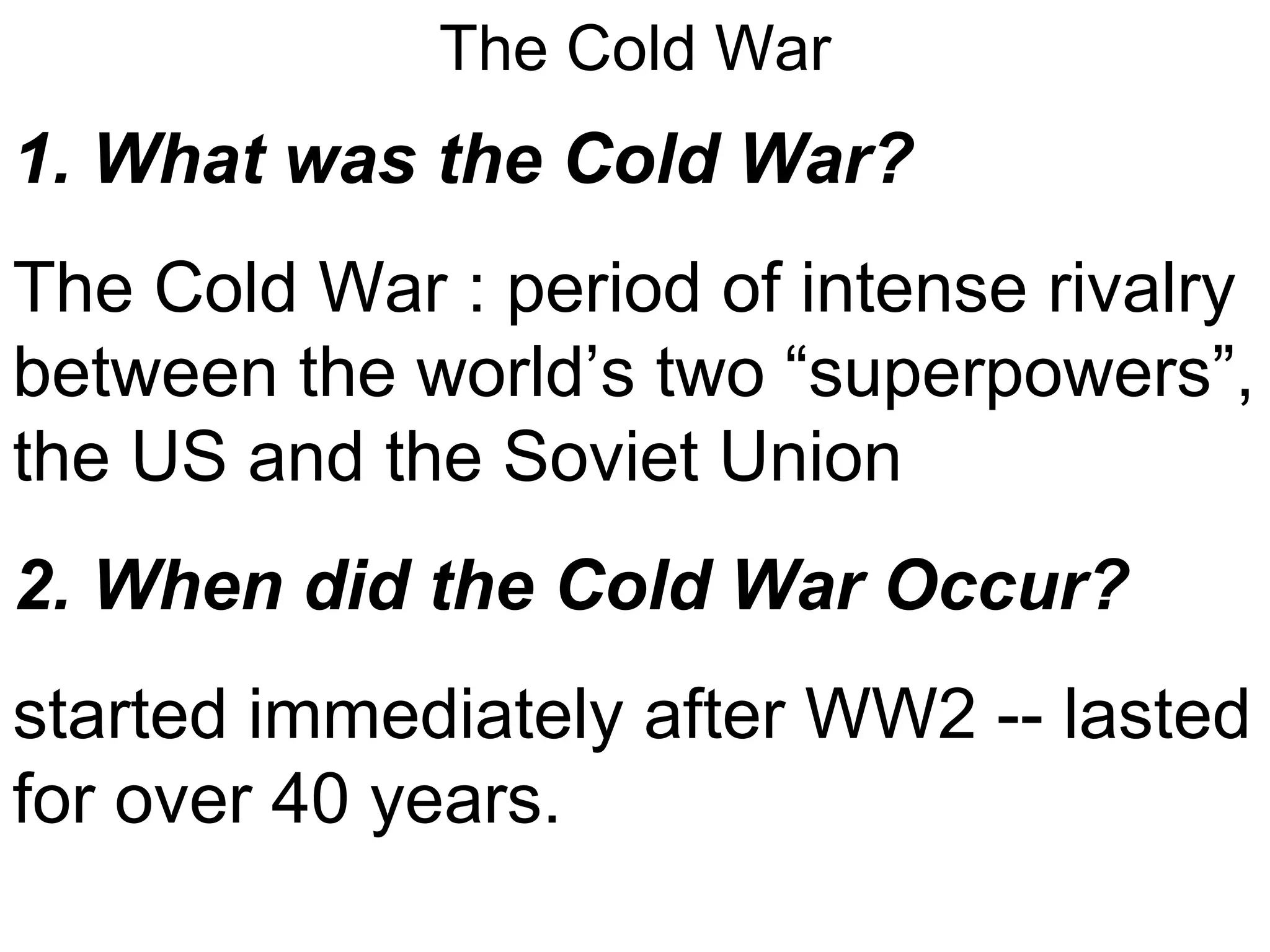 The Cold War was a period of intense rivalry between the US and Soviet Union that began after World War 2 and lasted over 40 years. Neither side engaged in direct military conflict due to nuclear weapons. The US established institutions and alliances like NATO to contain the spread of communism in Europe, while the Soviets set up communist governments in Eastern Europe behind an "Iron Curtain." This resulted in an arms race as both stockpiled nuclear weapons and a series of crises over places like Berlin.
