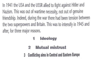 The document discusses the geopolitical situation in Europe in the late 1930s and early 1940s. It notes that Stalin and the USSR were seen as villains like Hitler at the time. It then outlines that the USSR invaded and took control of several countries, including signing a non-aggression pact with Nazi Germany. However, everything changed in 1941 when Germany invaded the USSR, marking the decisive stage of World War 2 in which the USSR defeated Germany, but at tremendous cost.