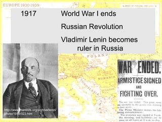 The document outlines major events from 1917 to 1991 related to the Cold War and rise and fall of communism. It begins with the Russian Revolution and Lenin becoming leader of Russia in 1917. Key events include the formation of the USSR in 1922, World War II, the start of the Cold War in 1945, the Berlin Blockade and establishment of NATO in 1949. It concludes with the fall of the Berlin Wall in 1989 and dissolution of the Soviet Union in 1991, marking the official end of the Cold War.