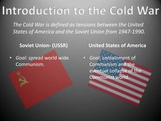 The Cold War was a period of tensions between the United States and Soviet Union from 1947-1990. The two superpowers had opposing goals - the Soviet Union aimed to spread communism worldwide while the US sought to contain communism and undermine the communist bloc. This ideological battle led to proxy wars, arms races, and a constant threat of global nuclear war that dominated international politics for decades.