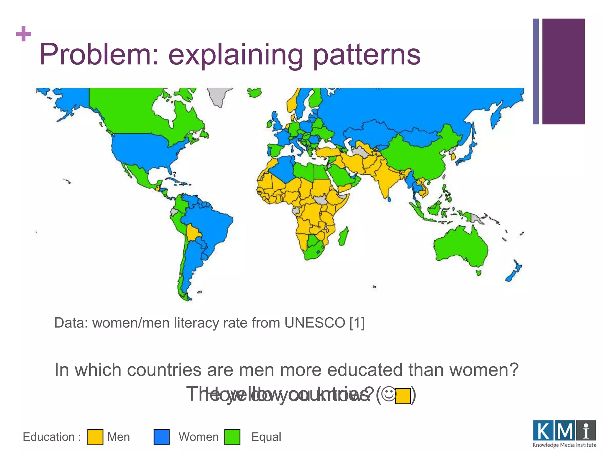 The document proposes a graph traversal approach called Dedalo to explain patterns in Linked Data using background knowledge from the graph. Dedalo uses an A* search algorithm to iteratively build a graph by dereferencing URIs, find explanation paths between initial nodes and entities in the graph, and build explanations by evaluating paths and final nodes. It finds the highest quality explanations for patterns like countries where men are more educated than women. Future work aims to improve Dedalo by addressing biases from incomplete data and combining multiple explanations.