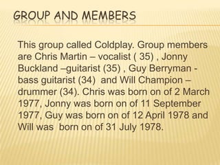 Coldplay is a British rock band consisting of four members: Chris Martin (vocals), Jonny Buckland (guitar), Guy Berryman (bass guitar), and Will Champion (drums). The band plays alternative rock, indie rock, and Brit pop music that has been influenced by Frida Kahlo's paintings. Some of Coldplay's most famous songs include "Clocks", "Paradise", "Viva la Vida", "The Scientist", and "Every Teardrop is a Waterfall".